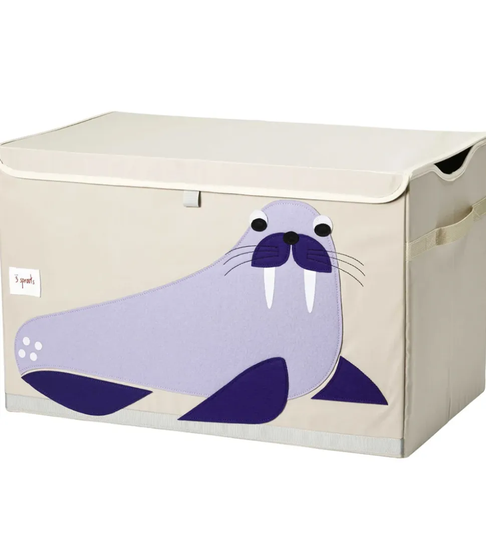 Sjov 3 Sprouts opbevaringskasse i beige med en sød, lilla hvalros på. Kassen har en firkantet og aflang facon med et foldbart låg foroven.