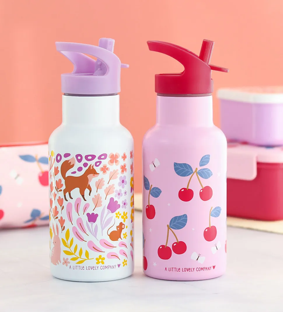 A Little Lovely Company drikkedunken kan indeholde 350 ml væske. Den er lavet i rustfrit stål, og tåler kun kolde drikke. Drikkedunken har et praktisk låg med en smart hank samt en sportstud, som kan foldes op og ned. Låget lukker tæt takket være en praktisk silikonekant.