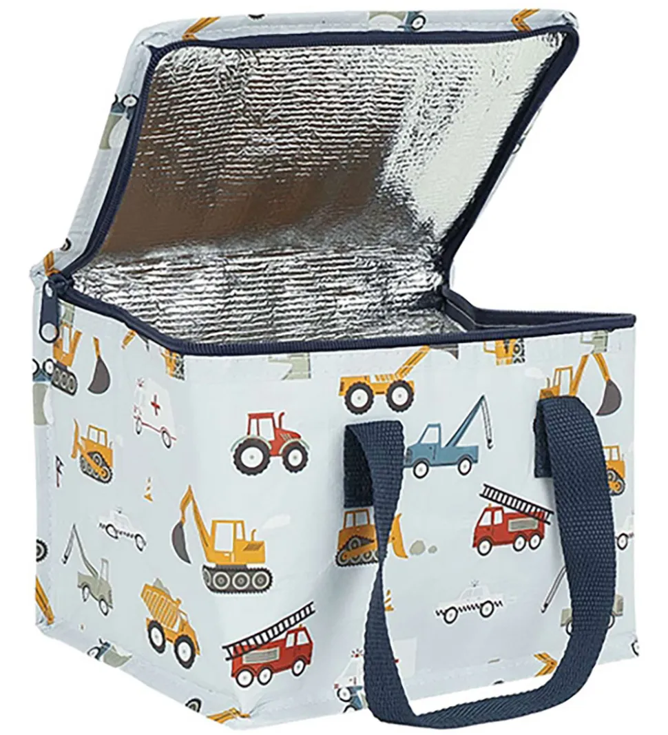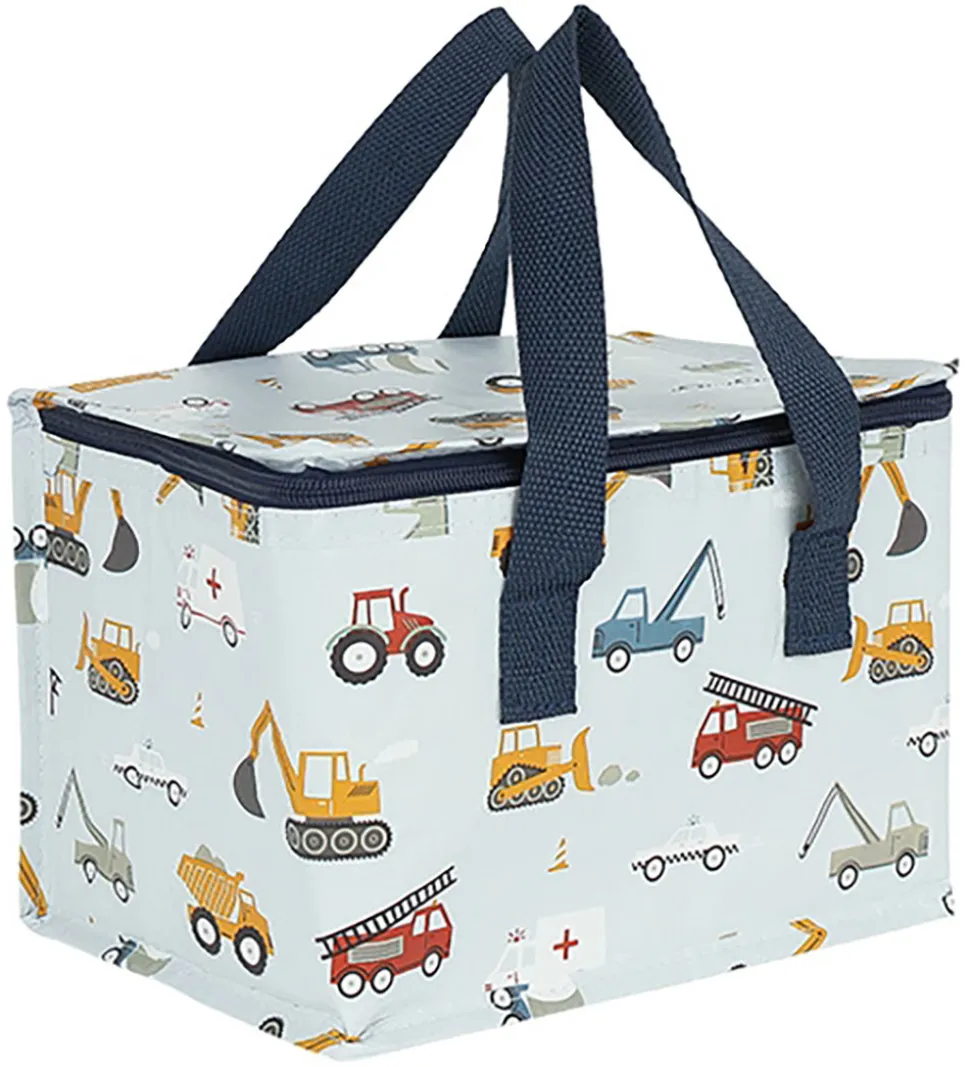 Fin A Little Lovely Company køletaske i lyseblå med et farverigt print med forskellige køretøjer samt med navyblå håndtag og lynlås