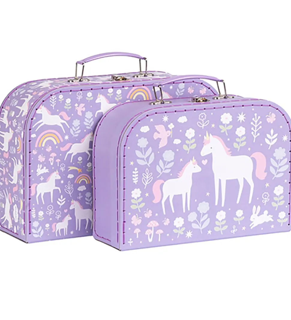 Fint A Little Lovely Company kuffertsæt bestående af to kufferter i lilla med enhjørningeprint.