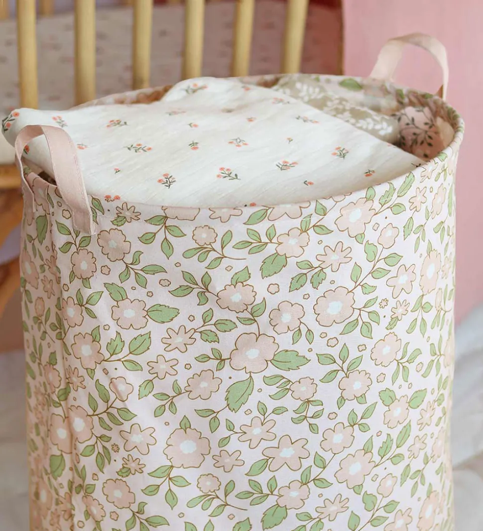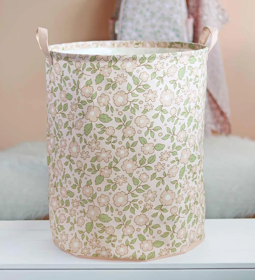 Pæn A Little Lovely Company opbevaringskurv i rosa med et alloverblomsterprint i rosa og grønne nuancer.