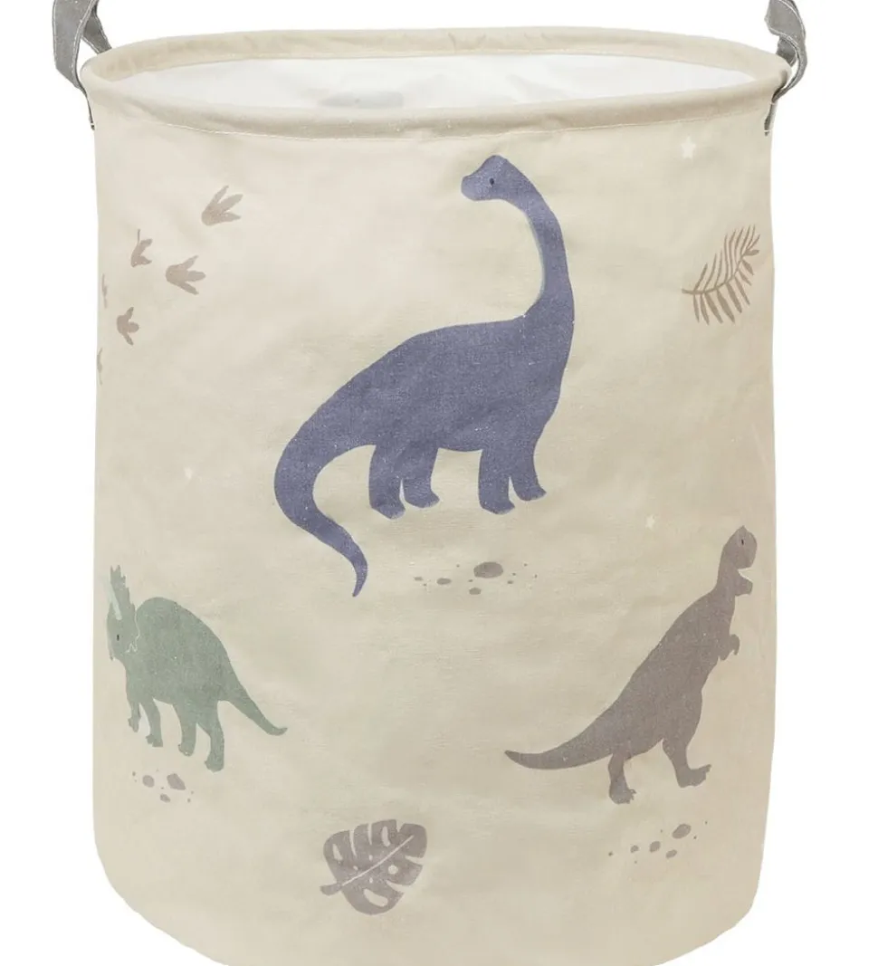 Flot A Little Lovely Company opbevaringskurv i beige med et print af dinosaurer i blå, grøn og brun.