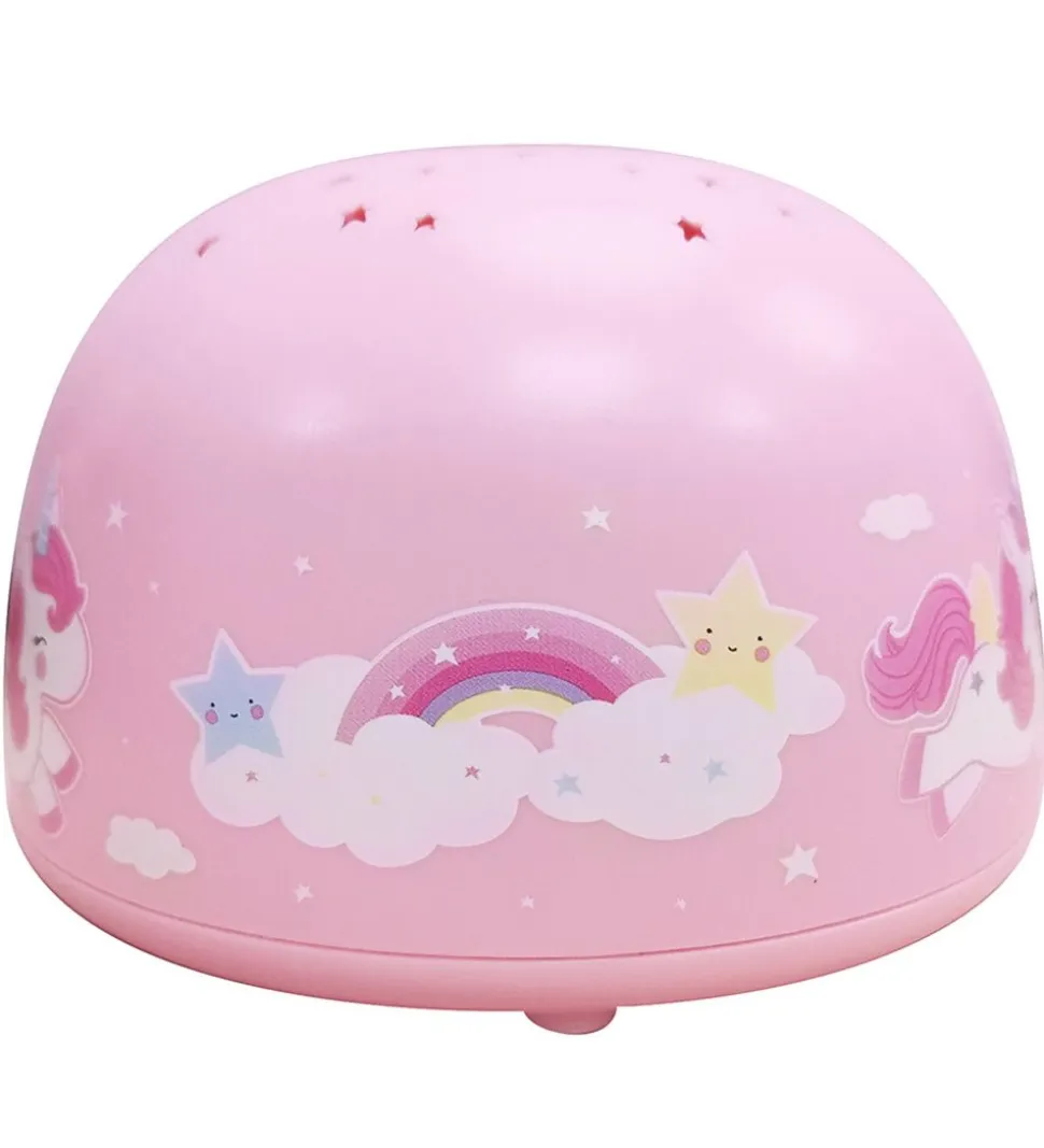 Smart A Little Lovely Company lampe med projektør-funktion, i lyserød med små enhjørninge og regnbuer på siden. Lampen har en rund form med små stjerner på toppen som fungere som lyshuller, og projektere stjerneforme op i loftet når lampen tændes.