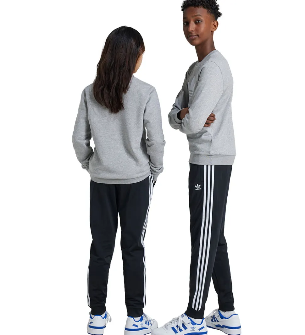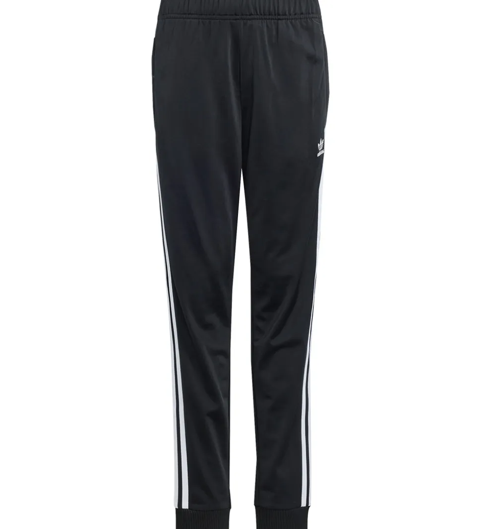 Smarte adidas Originals bukser i sort med de tre ikoniske, hvide striber langs buksebenets sider. På venstre lår er det klassiske ‘Trefoil logo’ i hvid.