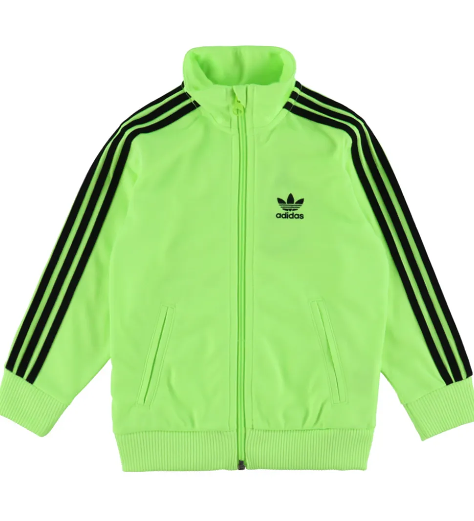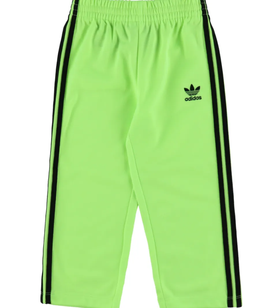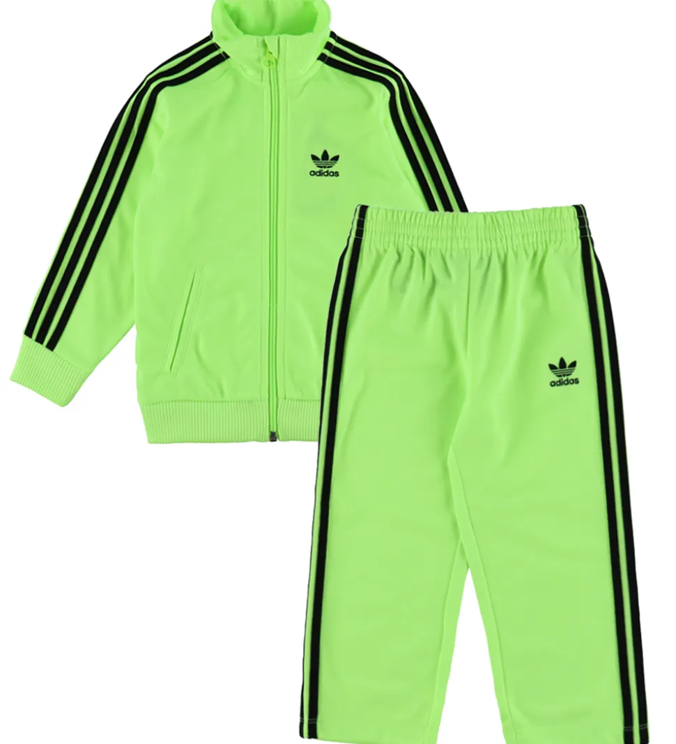 Smart adidas Originals træningssæt i en frisk, neongrøn farve med de klassiske, sorte striber og logo. Træningssættets enkle design gør det velegnet til mange forskellige aktiviteter.