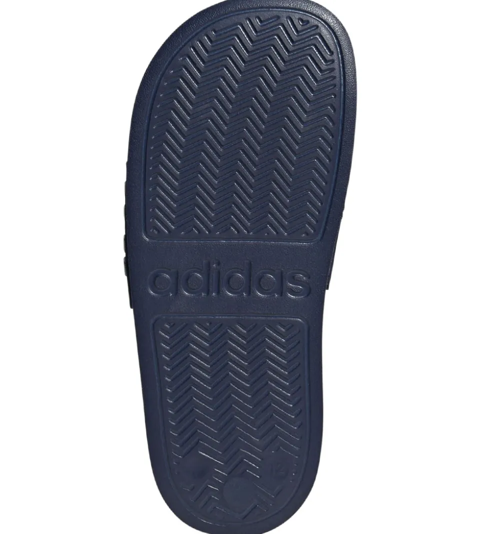 Lækker adidas Performance badesandal i en dyb blå nuance med tre kontrasterende hvide stropper på remmen.