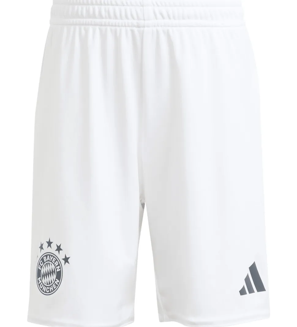 Flot adidas Performance fodboldsæt i hvid bestående af en t-shirt og et par shorts i hvid med orange og sorte detaljer samt et par hvide fodboldstrømper. T-shirten har flotte vandrette striber i grå, sort, rød og koral samt de klassiske adidas striber på begge skuldre. T-shirten og shortsene har logoer fra FC Bayern München og adidas samt allianz logoet på venstre ærme.