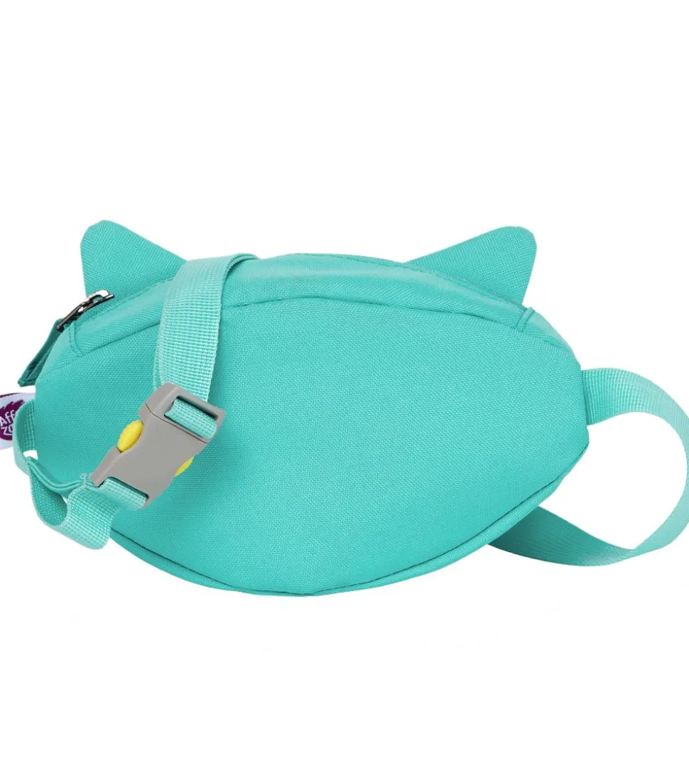 Sød Affenzahn bæltetaske i turkis og pink med form som en ugle. Fortil er der et par sorte og hvide øjne og et gult næb. Næbet sidder fast med en elastik, og når man trækker i det, kommer der et navnemærke til syne.