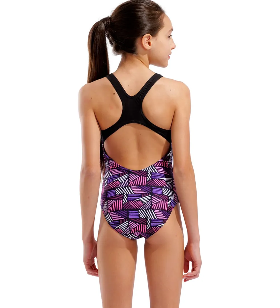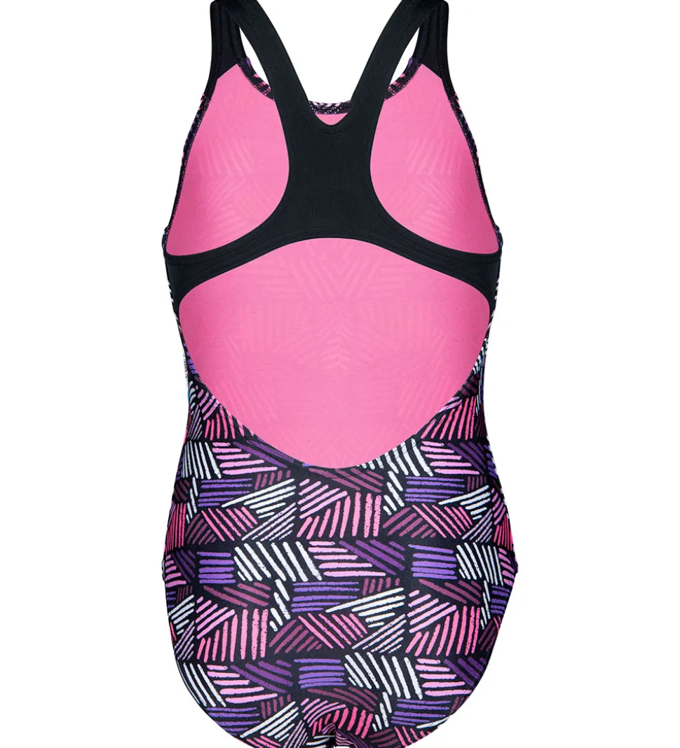 Smart Arena badedragt sort med et øjnefaldende mønster med vandrette og lodrette linjer i lilla, pink og hvid.