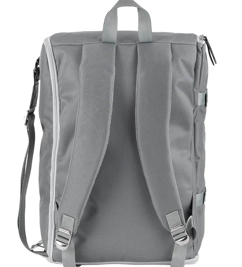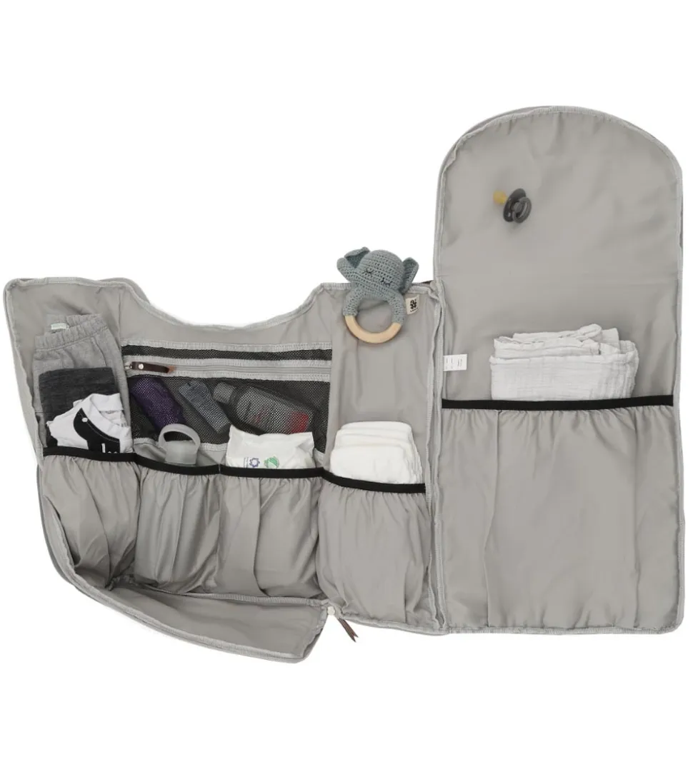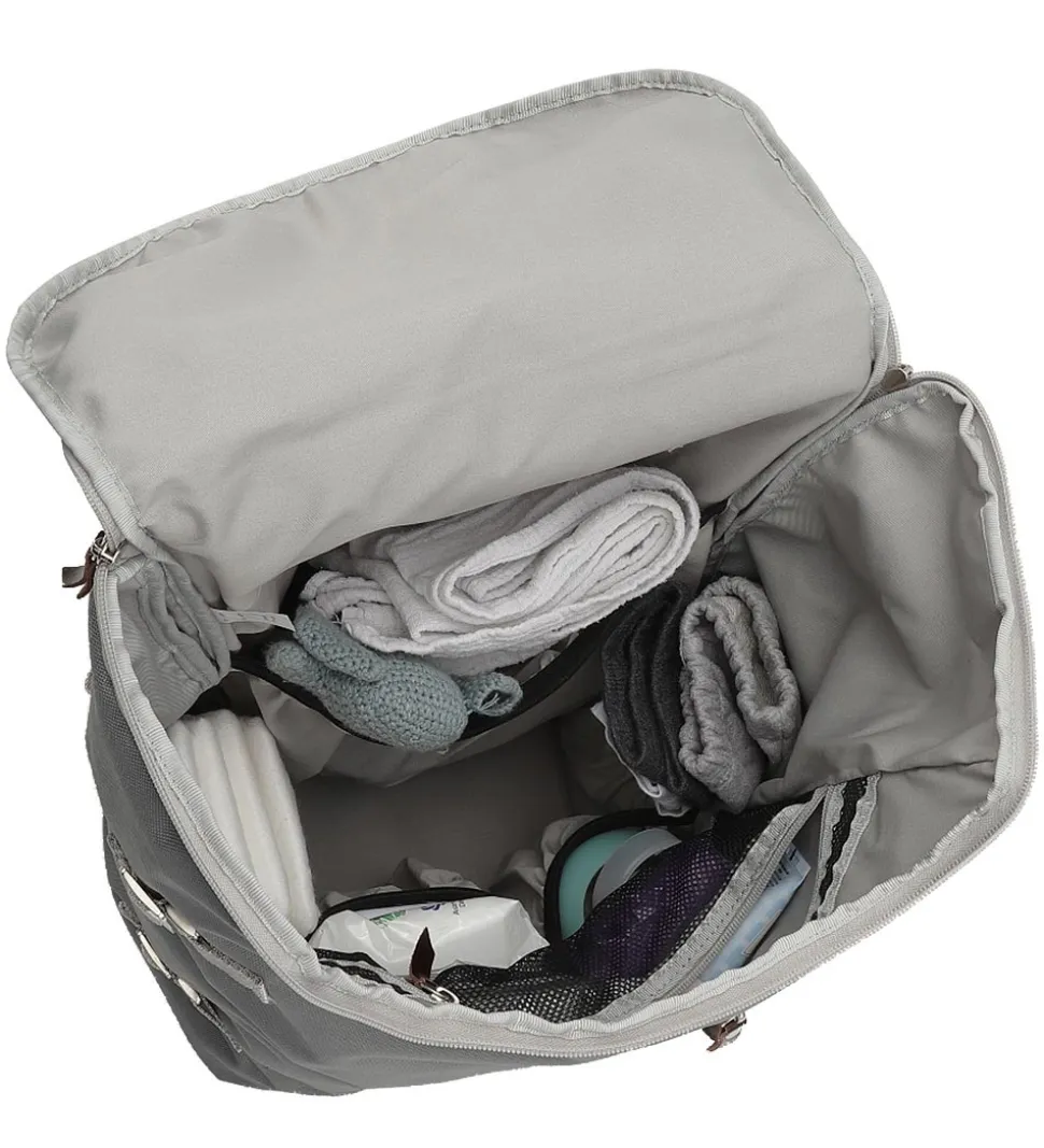 pusletasken åbnes på toppen med en lynlås, som også kan lynes op så tasken kan foldes helt ud. Indvendigt har tasken en masse fine lommer, med plads til en masse af babys pusleting. Tasken har to gode polsterede justerbare skulderstropper, samt en strop i toppen så tasken både kan bæres på ryggen og i hånden. Der medfølger også en smart justerbar strop som kan påsættes på taskens side, så den også kan bærges som en cross body taske eller sættes på barnevognen. På fronten er en praktisk lille lomme med plads til en masse små ting, lommen lukkes med en lynlås.