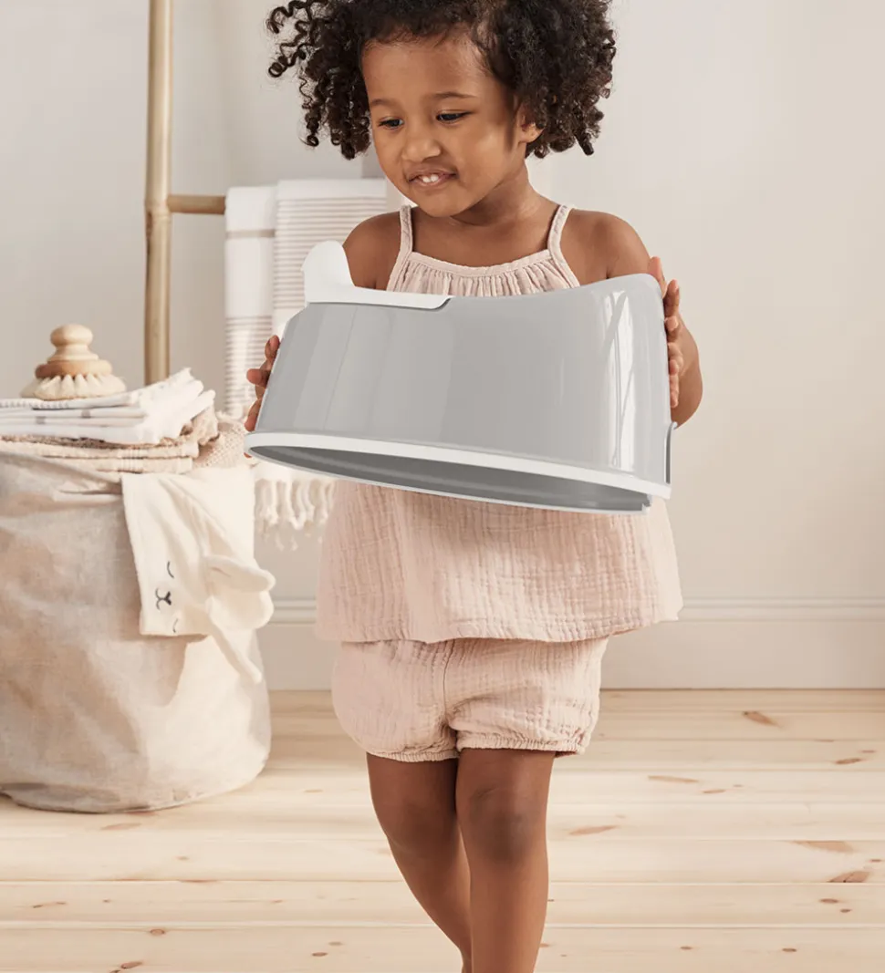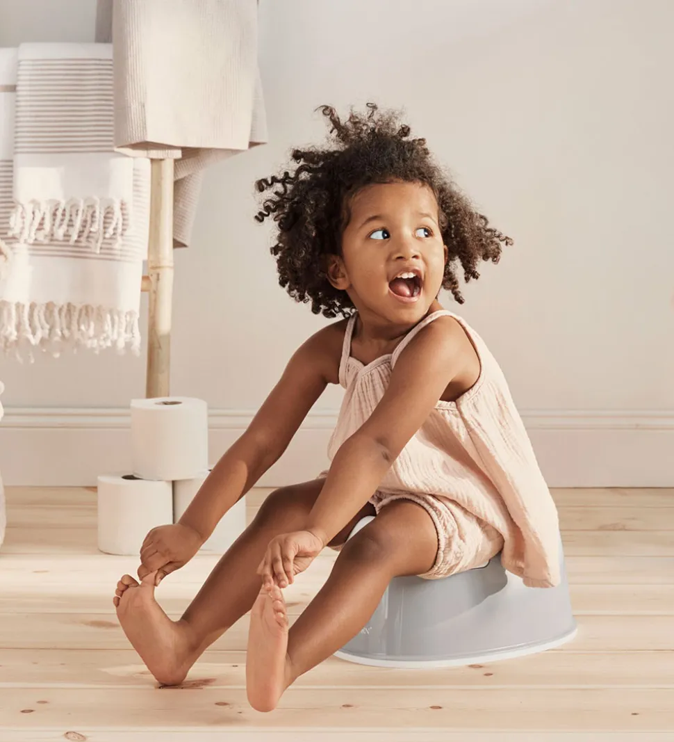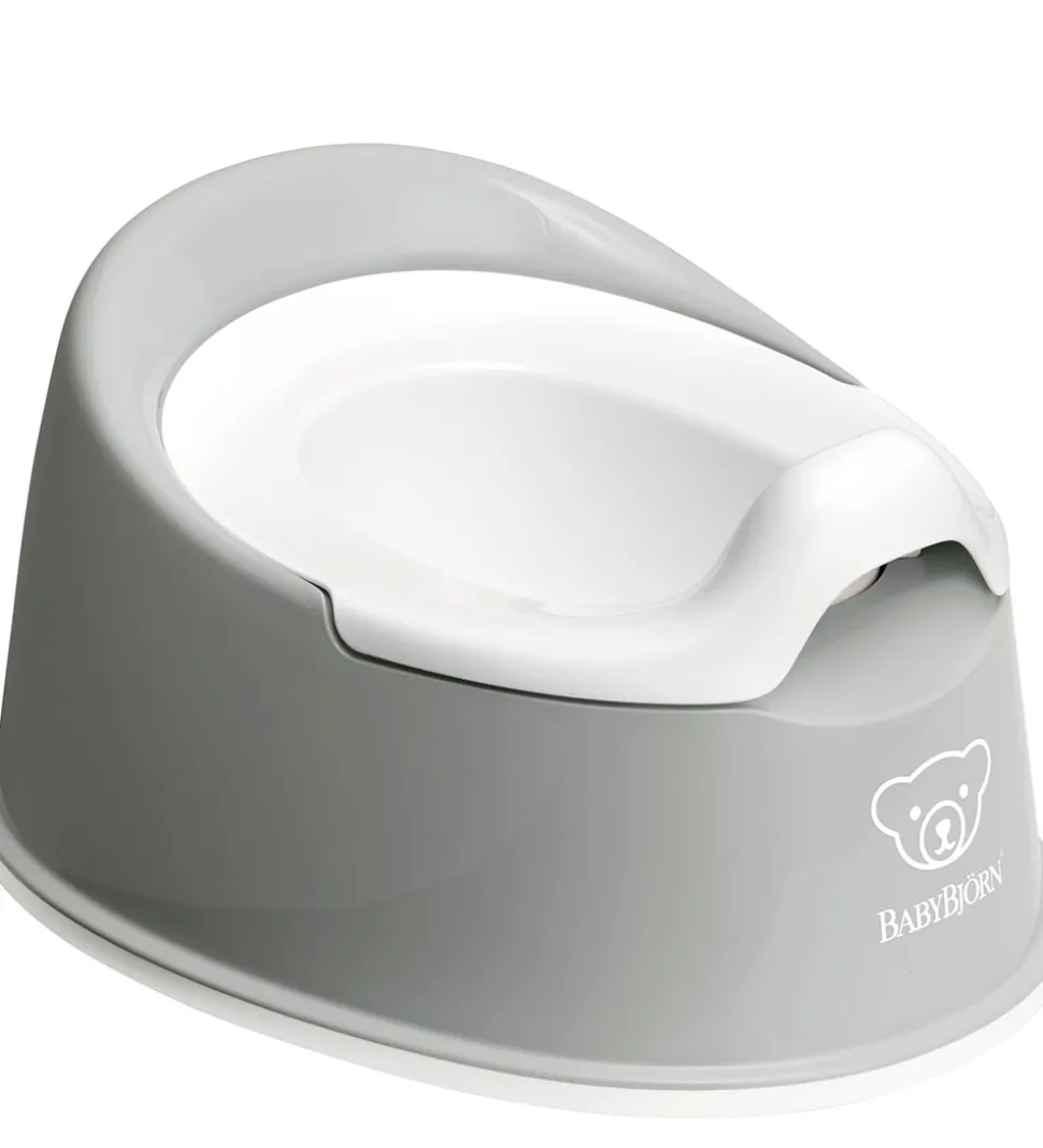 God BabyBjörn potte i grå med et logoprint på fronten.
