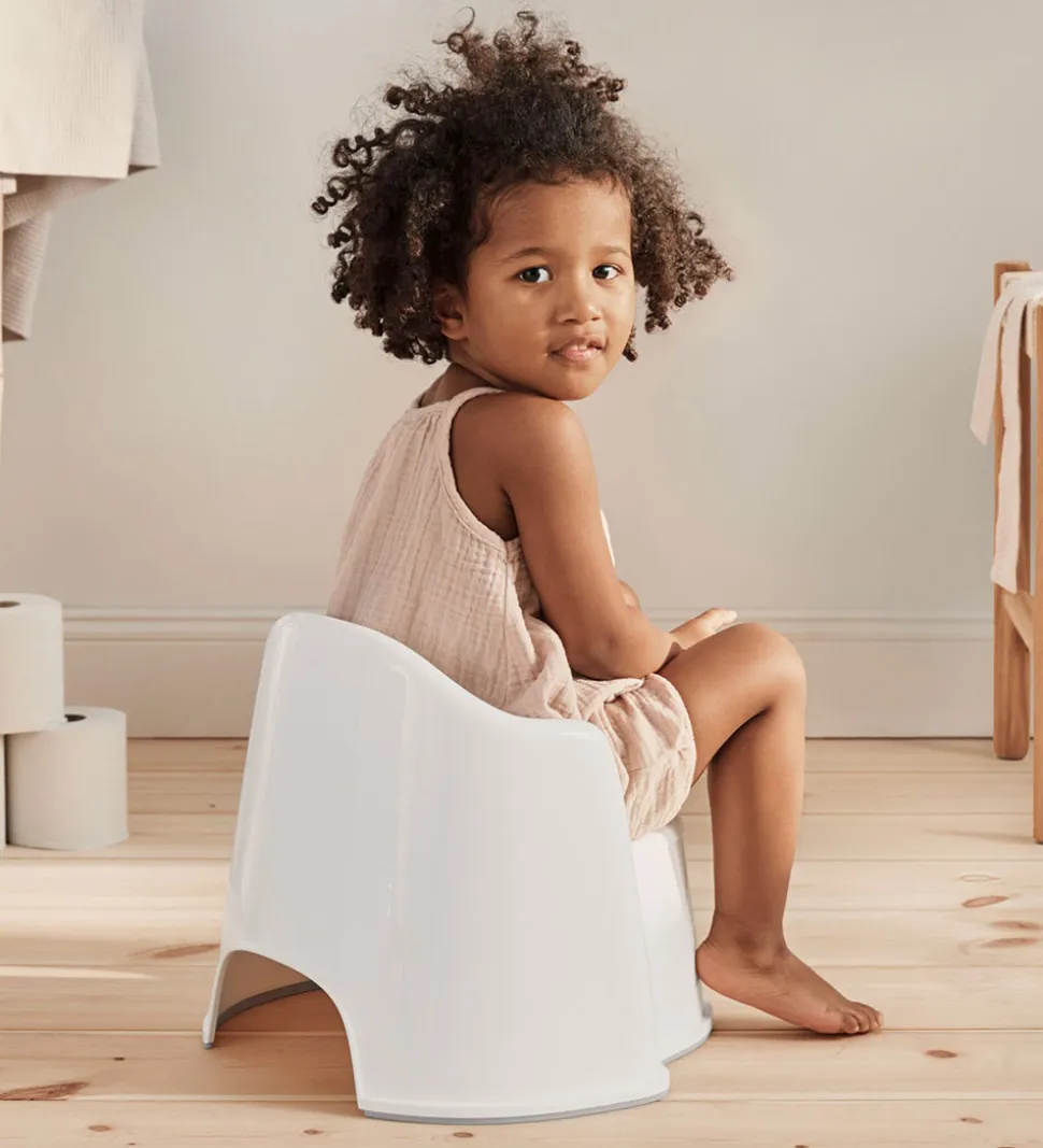 Praktisk BabyBjörn potte i hvid med et logoprint på fronten.