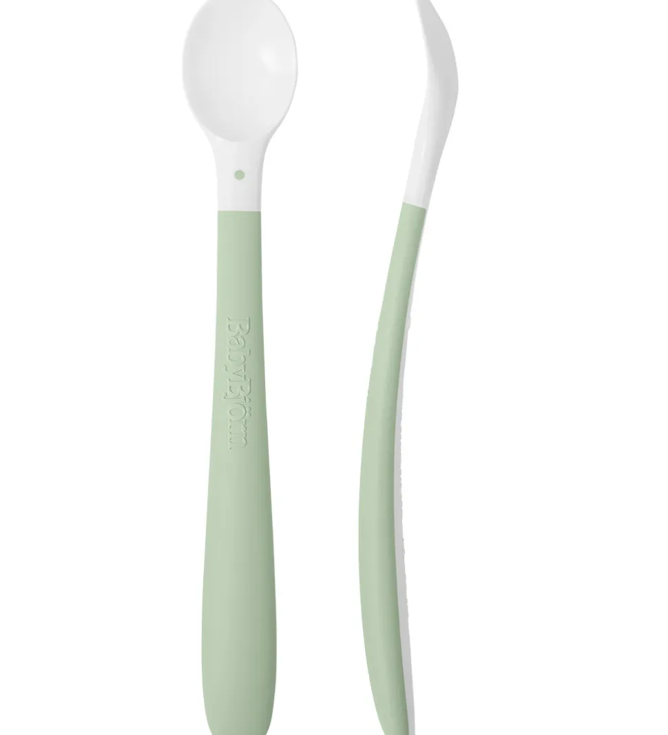 Fine BabyBjörn skeer i pastelgrøn og hvid solgt i en 2-pak. Skeerne er lette at holde om og har et lille skeblad.