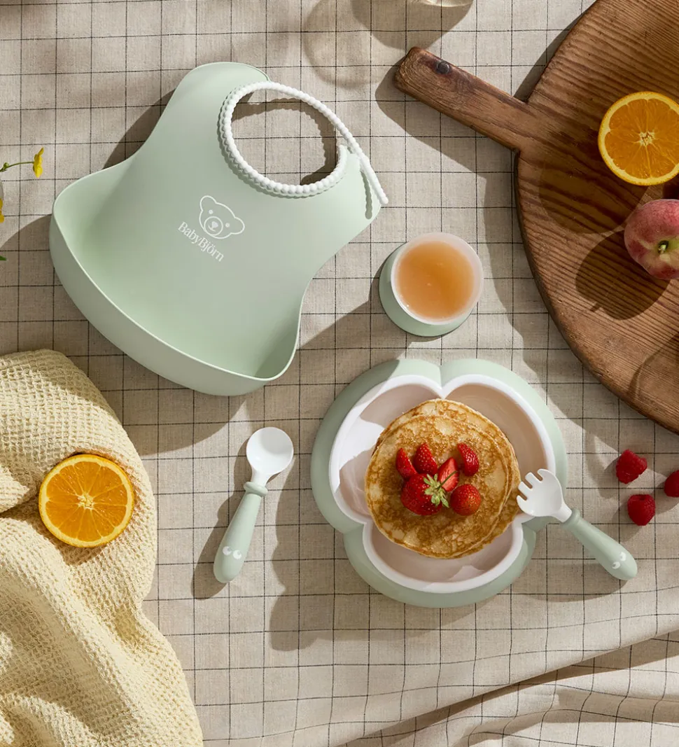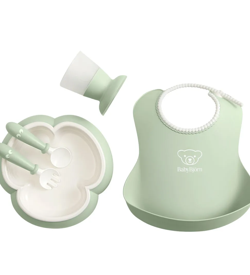 Fint BabyBjörn spisesæt i pastelgrøn og hvid bestående af følgende dele: