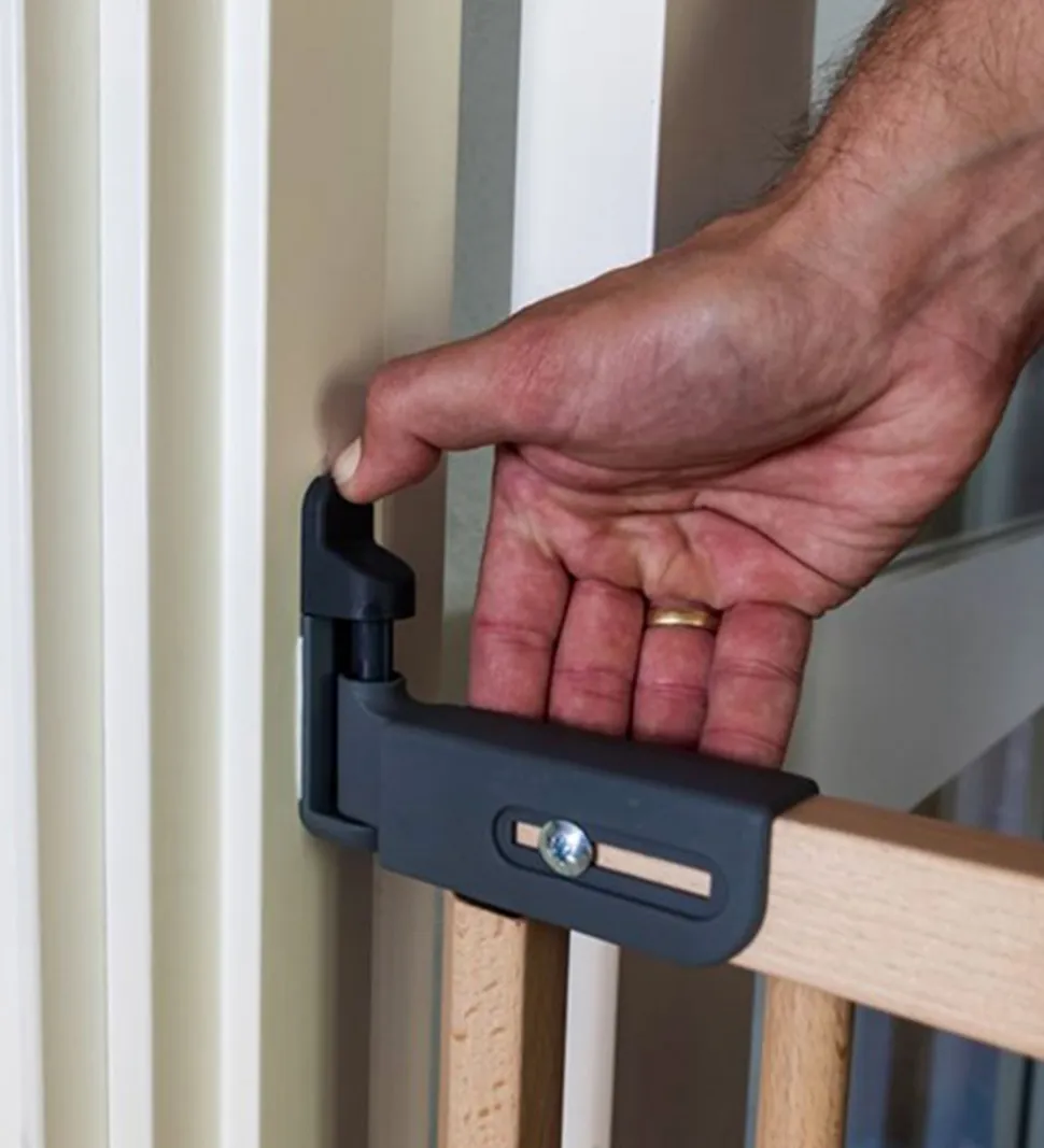 BabyDan gitteret monteres på væggen eller dørkarmen. Gitteret kan åbnes fra begge sider, og det kan betjenes med kun én hånd. Der skal ikke bruges værktøj til at montere det, så det er let at fjerne, når der ikke længere er behov for det.