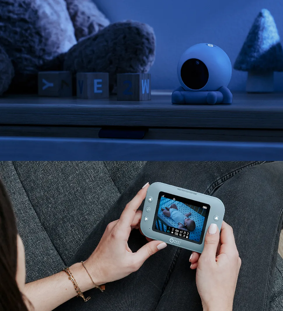 Smart Babymoov babyalarm med video i en støvet grågrøn farve.
