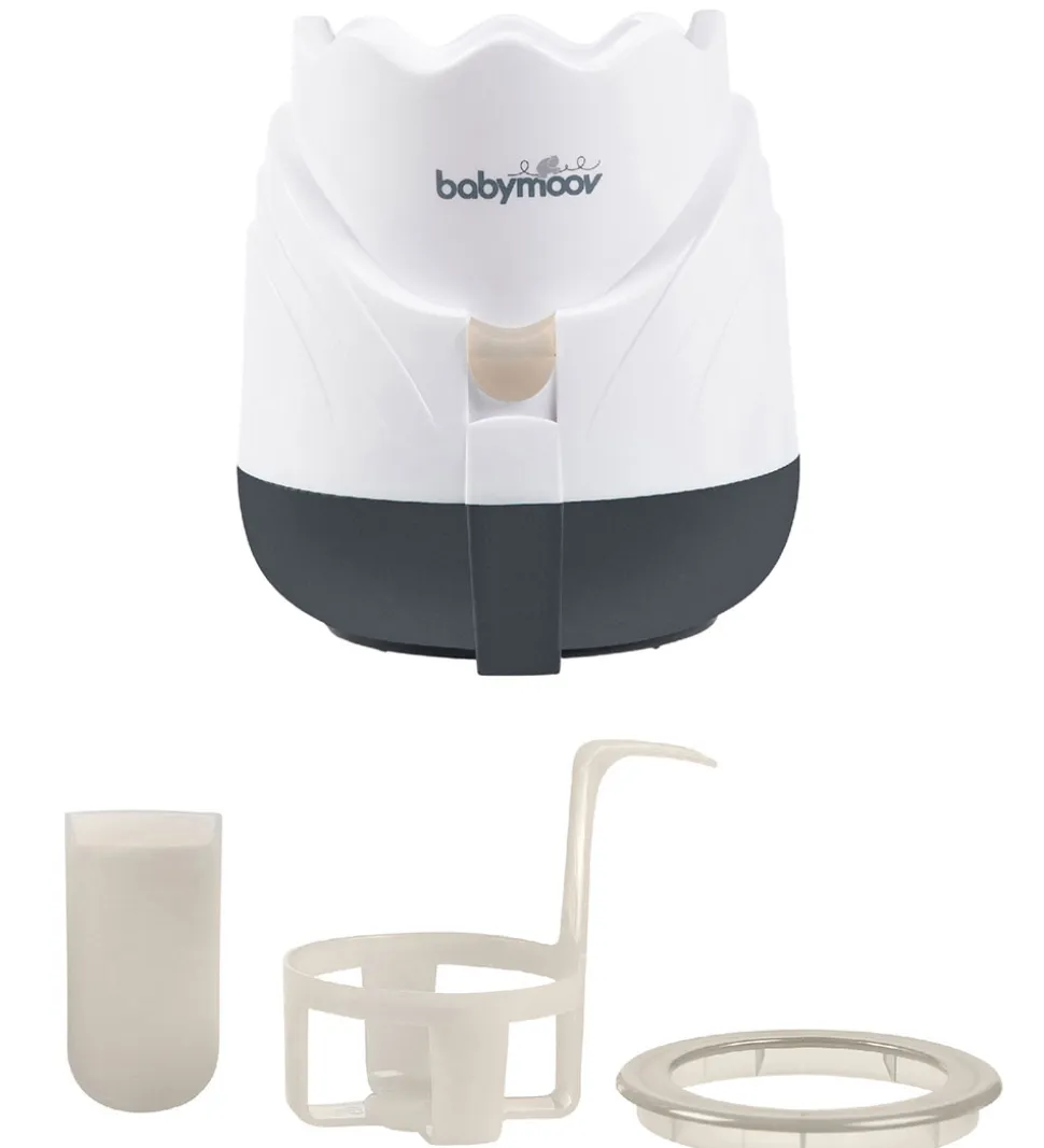 Babymoov flaskevarmeren passer til alle slags sutteflasker, og den kan opvarme glas med babymad. Flaskeopvarmeren kan opvarme 240 ml væske på blot 3,5 minut. Når mælken er opvarmet, lyser en lampe på fronten, og flaskevarmeren slukker automatisk, når den er færdig. Der medfølger adaptere, så sutteflasken står stabilt i flaskevarmeren.