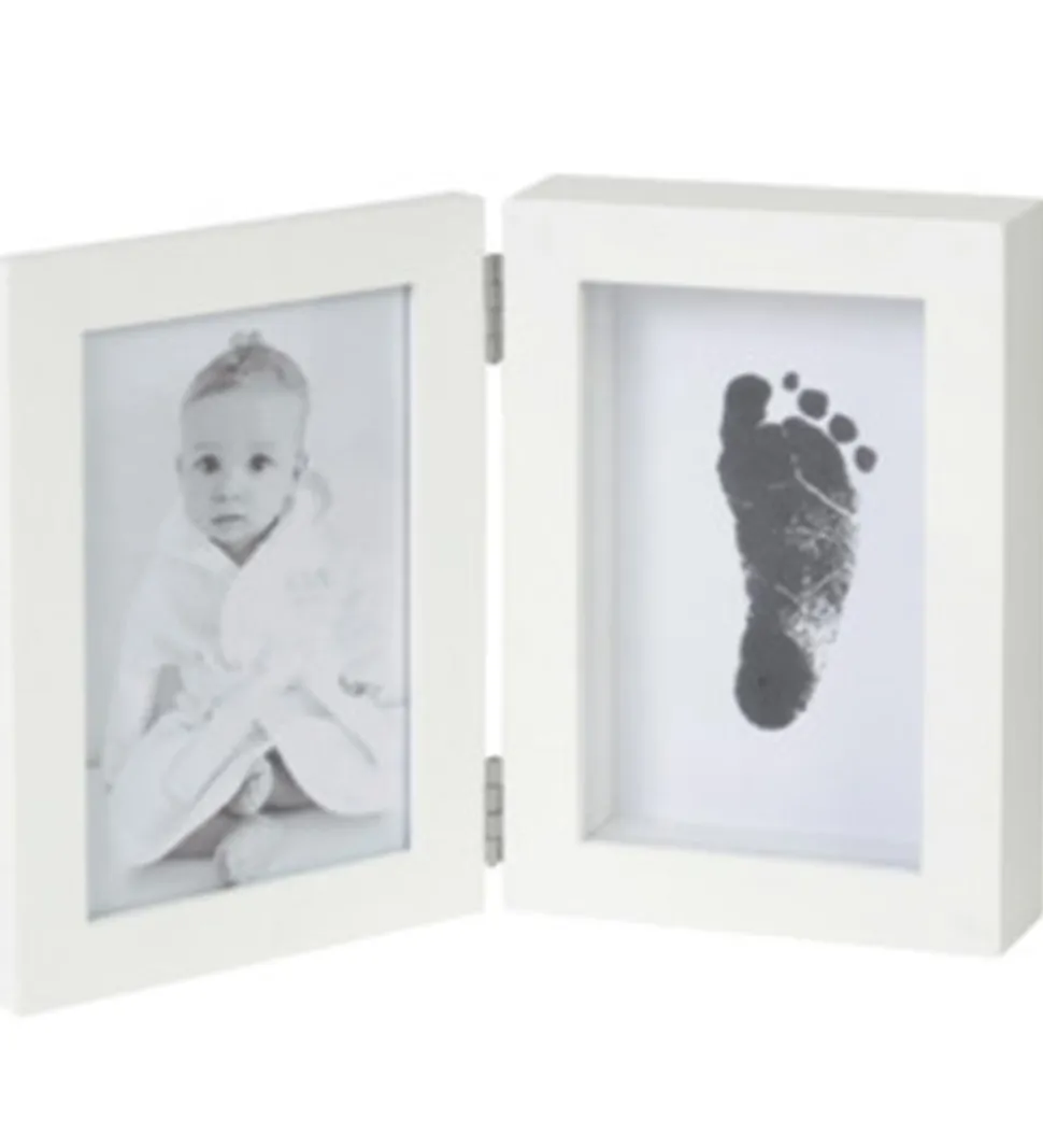 BAMBAM billedrammen ebstår af to billedrammer sat sammen med hængsler, og i den en ramme kan man sætte et hånd- eller fodaftryk af sit barn, mens der i den anden ramme er et billede af billedet. Der medfølger materiale til at tage et blækaftryk af barnets hånd eller fod.