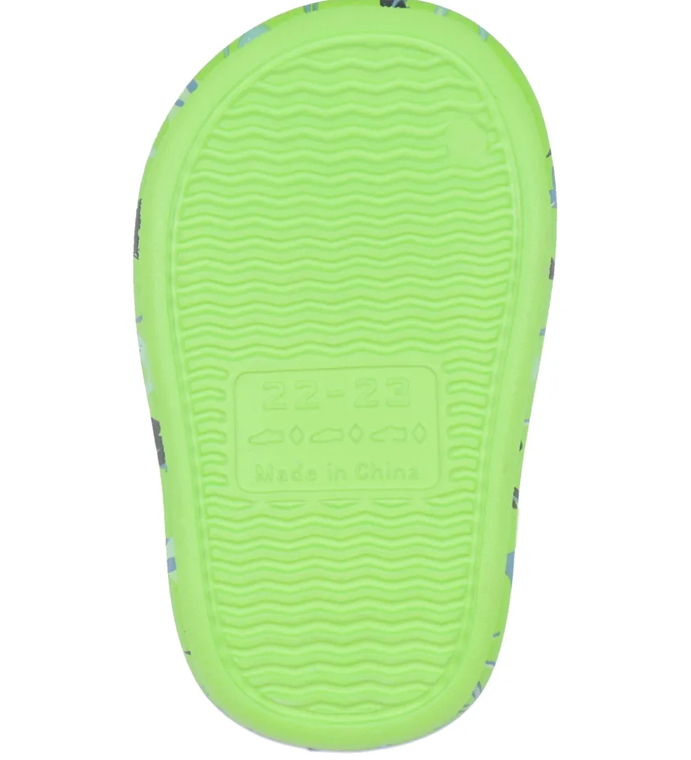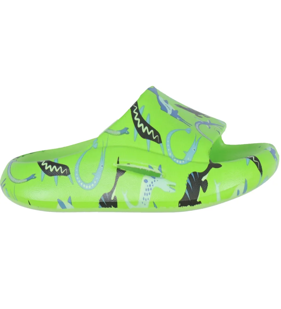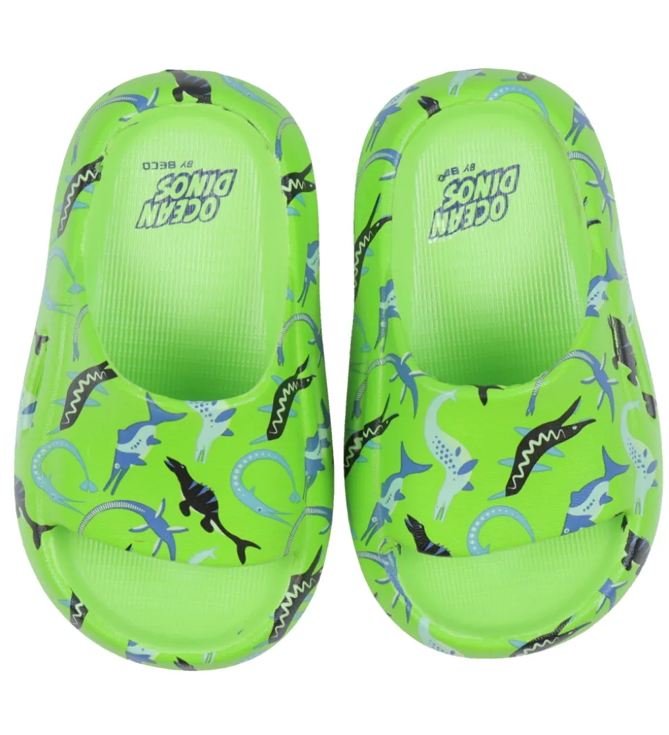 Lækre BECO badesandaler i lysegrøn med et alloverprint af forskellige vand dinosauerer i flotte farver.