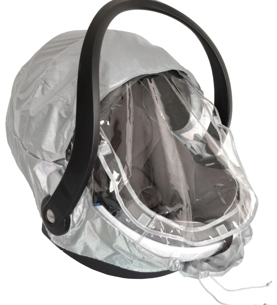 Praktisk BeSafe regnslag i grå PE og gennemsigtigt plastik.