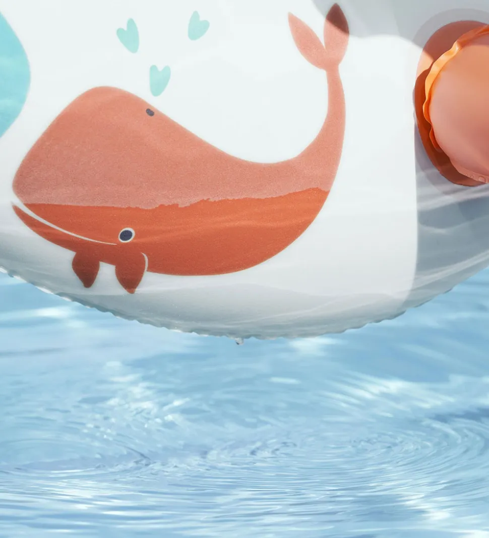 Flot Bestway flyder med form som en båd og lavet med en solskærm, der giver skygge. Flyderen er i hvid med søde havdyrsprints i orange og blå.
