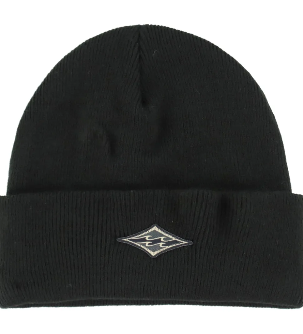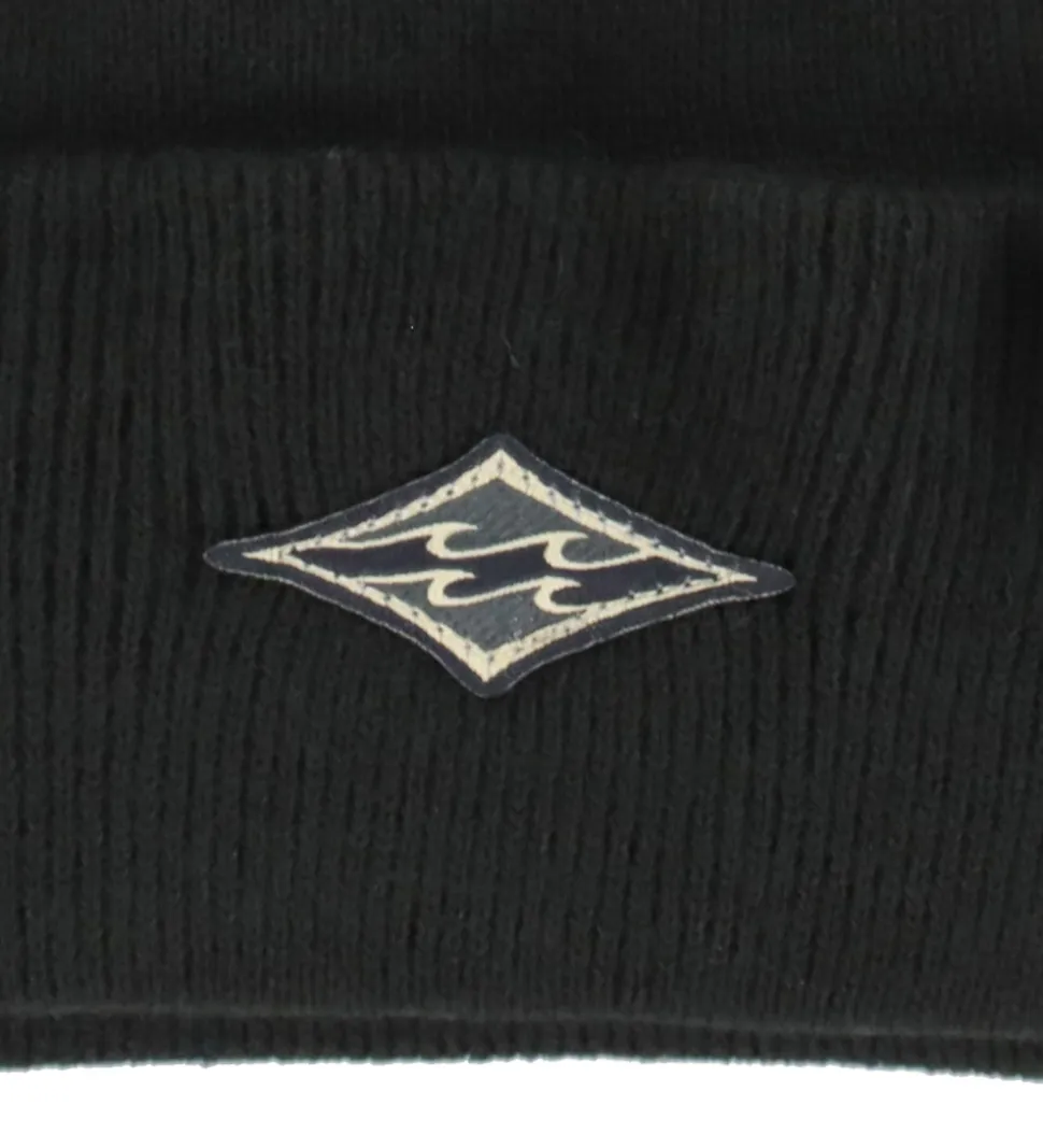 Flot Billabong hue i sort med et lille logo foran. Huen har en strikket struktur og en rund hovedform. Nederst er der et bredt ombuk. Huen består af to lag.