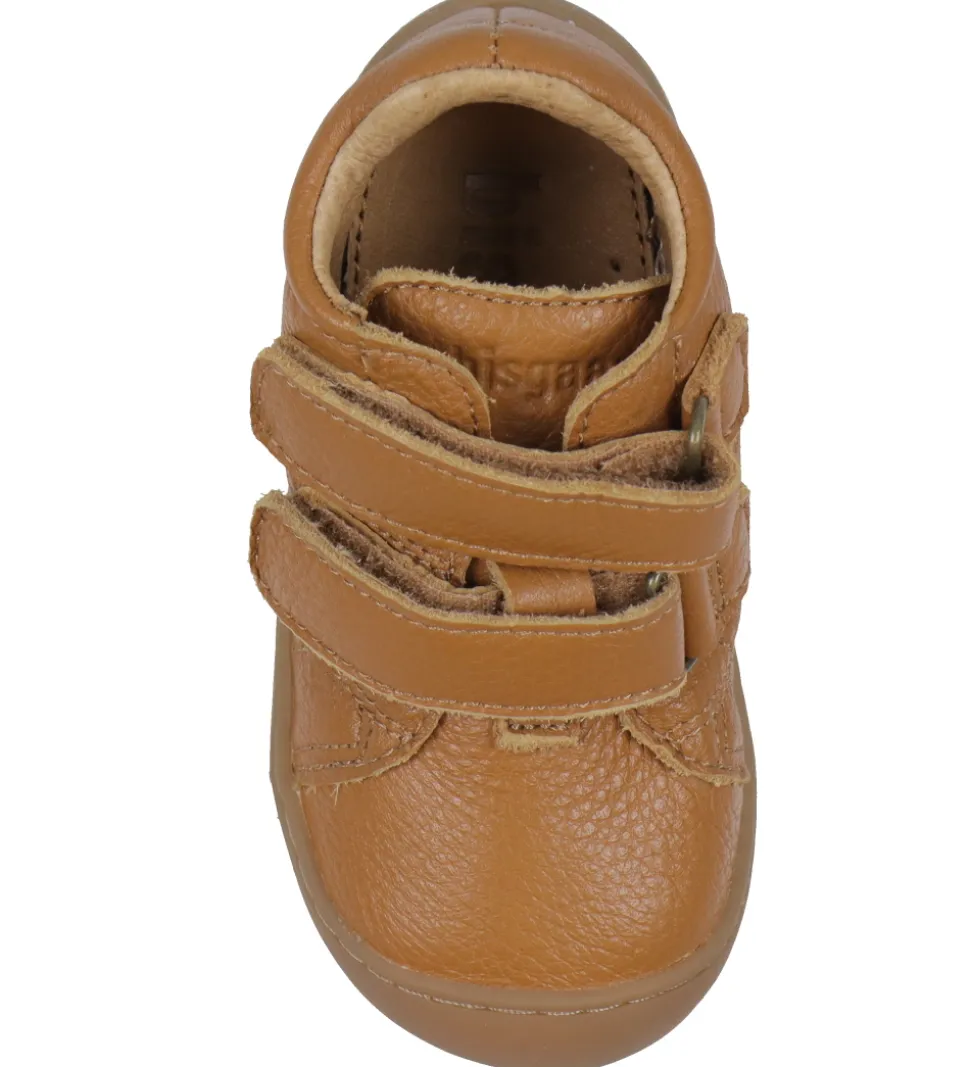 Bisgaard begynderskoene lukkes over vristen med to velcroremme, så de nemt kan tilpasses barnets fod. På indersiden er de foret med blød skind, og bagtil er der en fast hælkappe. Indersålen er blød og udtagelig.
