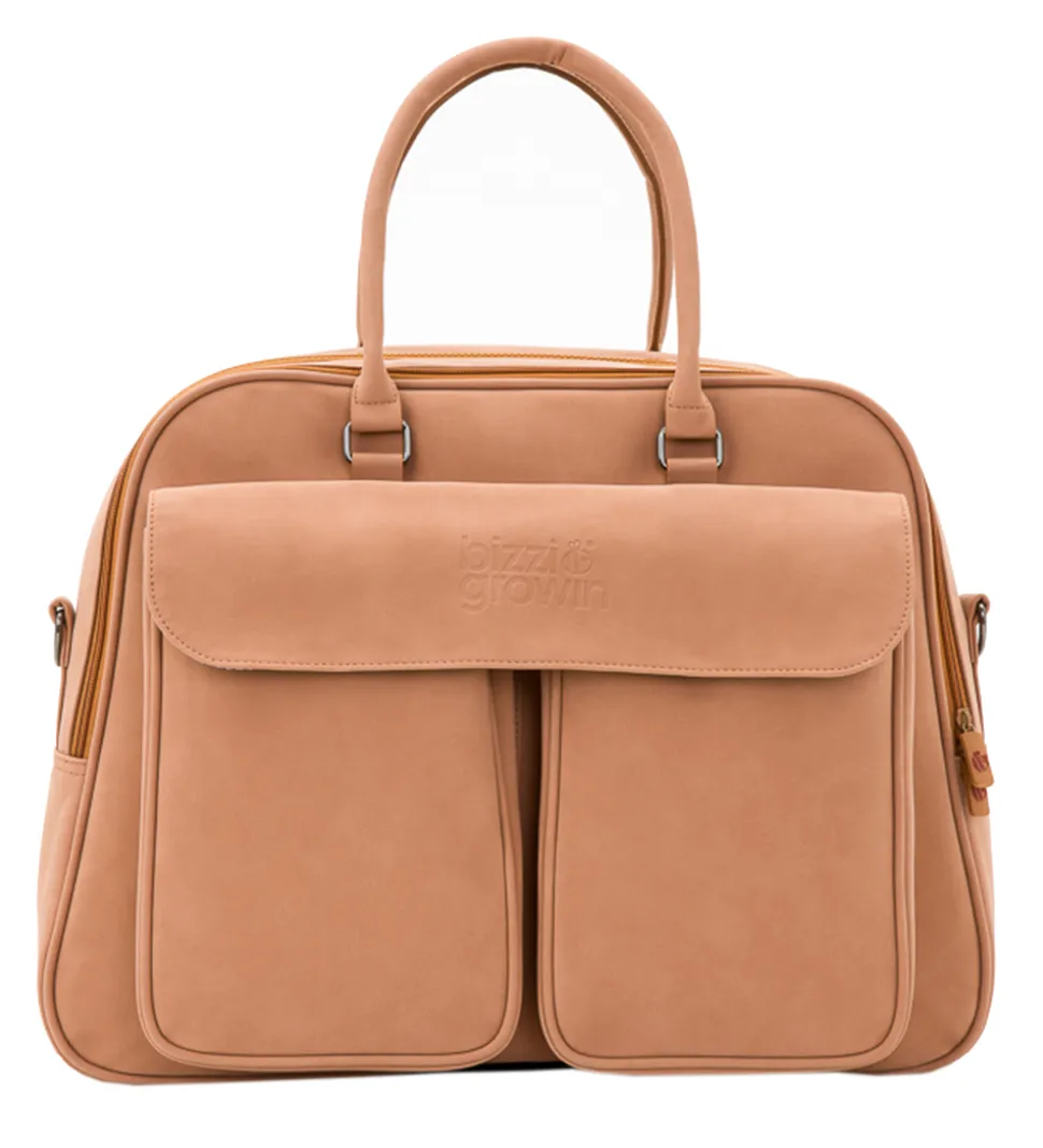 Den kombinerede pusletaske og rejseseng fra Bizzi Growin har en justerbar og aftagelig skulderstrop samt to bærehåndtag, og der medfølger også barnevognsstropper, så den kan fastgøres til barne- eller klapvognen.