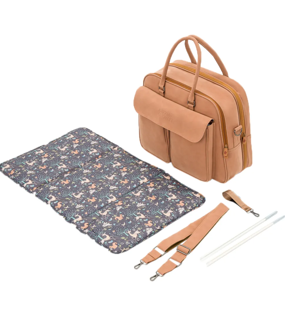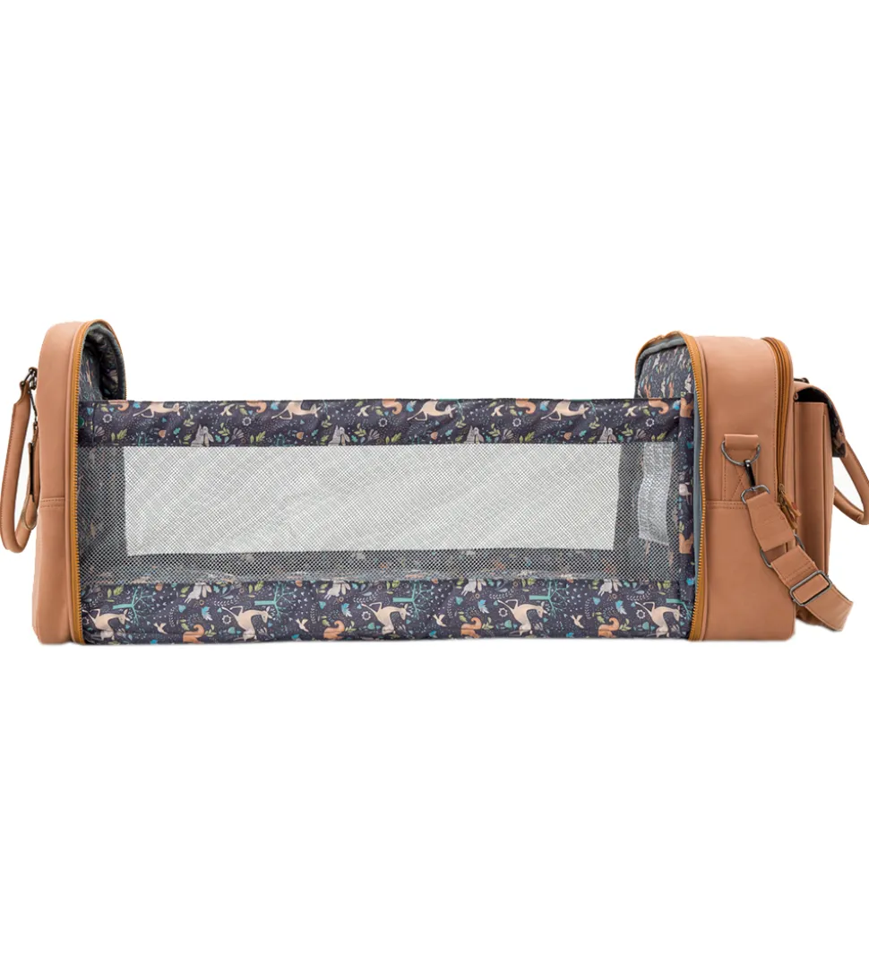 Smart Bizzi Growin kombineret pusletaske og rejseseng i lysebrunt, vegansk læder. Indvendigt har den et sort for med et farverigt dyreprint.