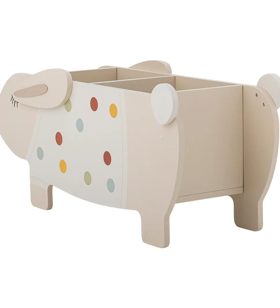Charmerende Bloomingville bogkasse i form af en beigefarvet kanin med farverige prikker. Bloomingville bogkassen består af to rum, og den tilbyder en dekorativ og funktionel løsning til organisering i hjemmet, samtidig med at den tilfører et legende præg.