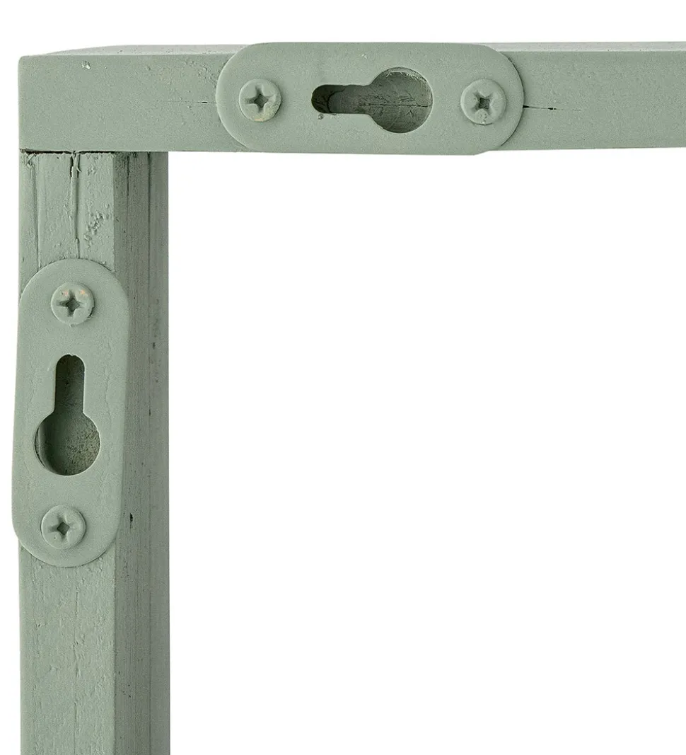 Flot Bloomingville hylde i træ malet i støvet grøn med et patineret look.