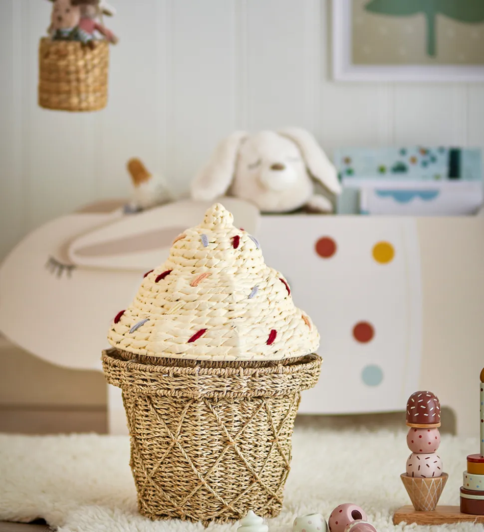 Charmerende Bloomingville kurv i en naturlig tone, formet som en isvaffel. Bloomingville kurven har farverige detaljer på “isen”, der giver et livligt udtryk. I toppener der et låg, som kan tages helt af. Perfekt til opbevaring og dekoration.