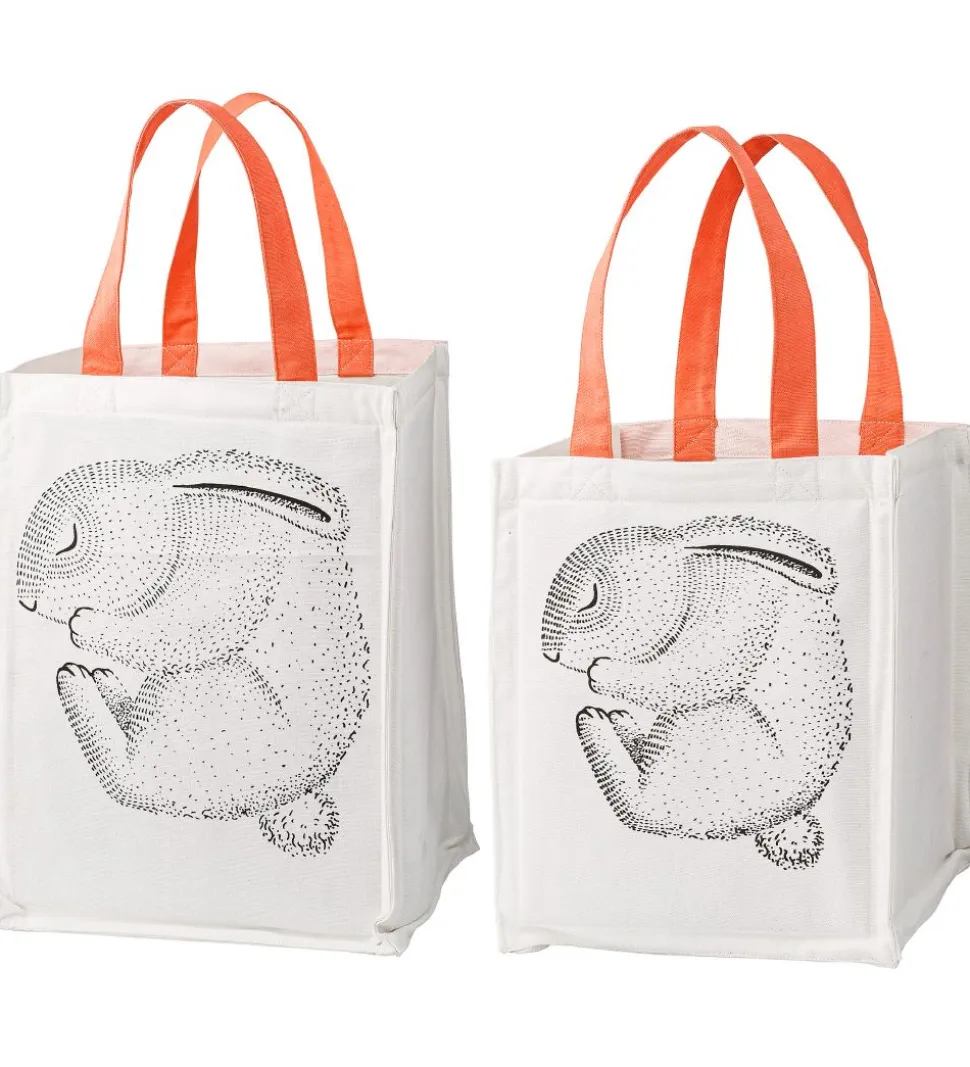 Smarte Bloomingville opbevaringsposer i hvid. På forsiden er der et sort print af en sovende kanin, og på bagsiden er den rosa med hvide prikker med et flot mønster.