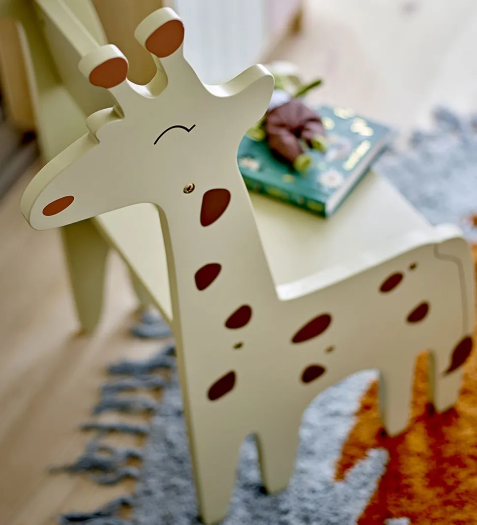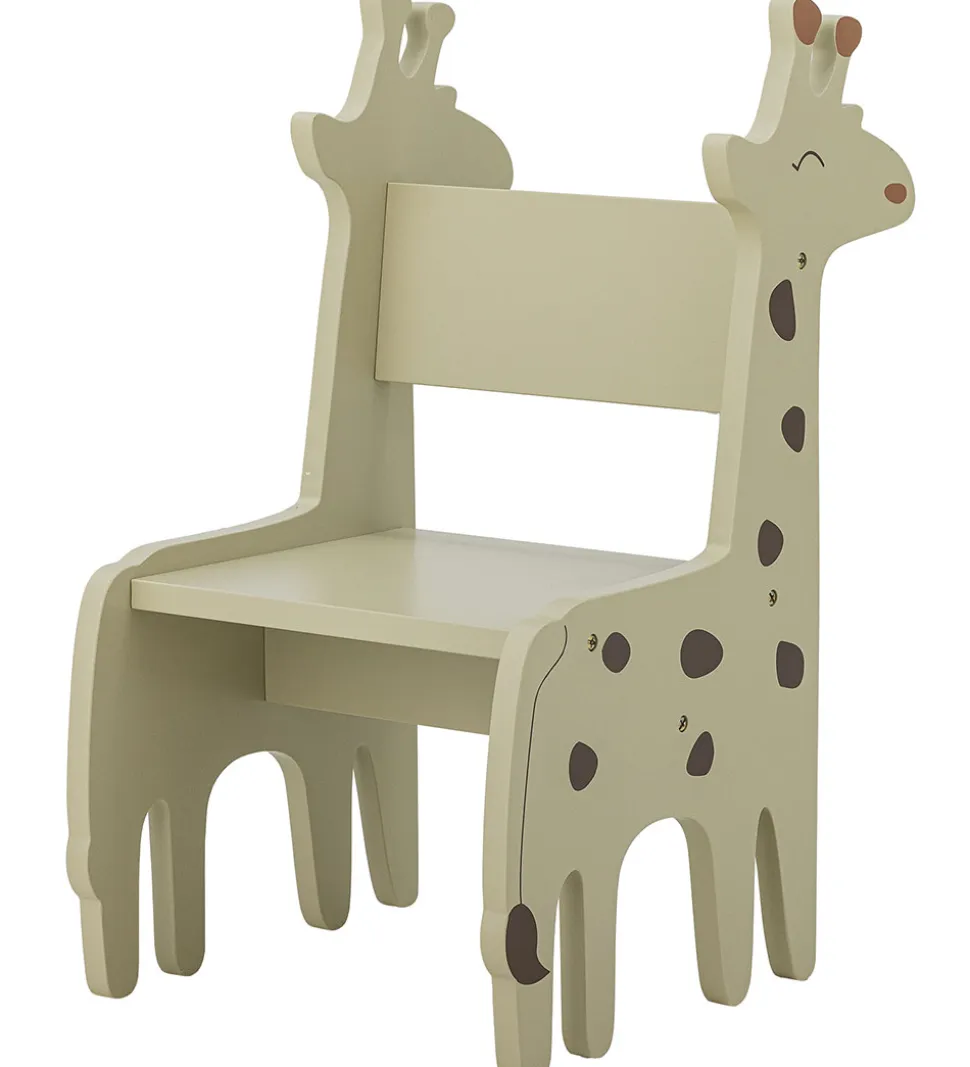 Charmerende Bloomingville stol i en grøngrå nuance med et sjovt giraf-design. Bloomingville stolen er både dekorativ og funktionel, perfekt som en unik tilføjelse til børneværelset.