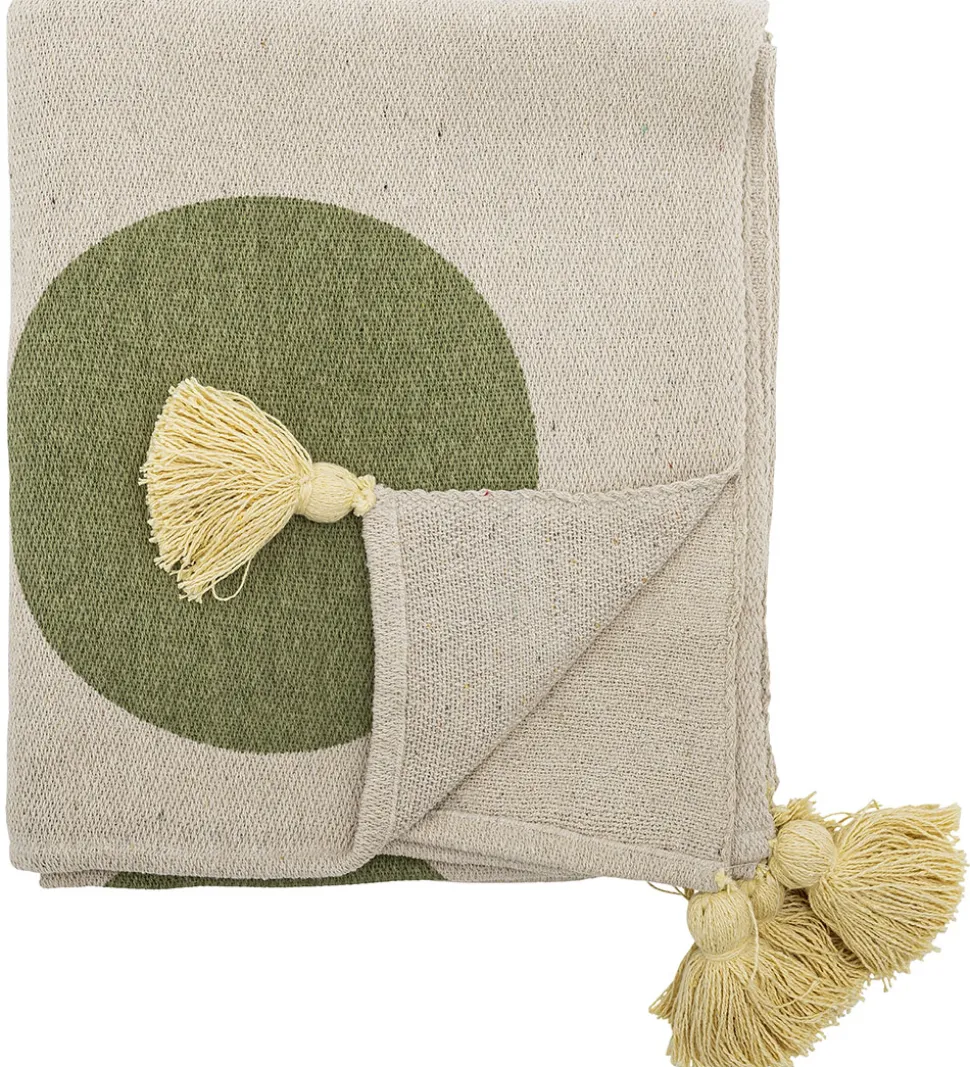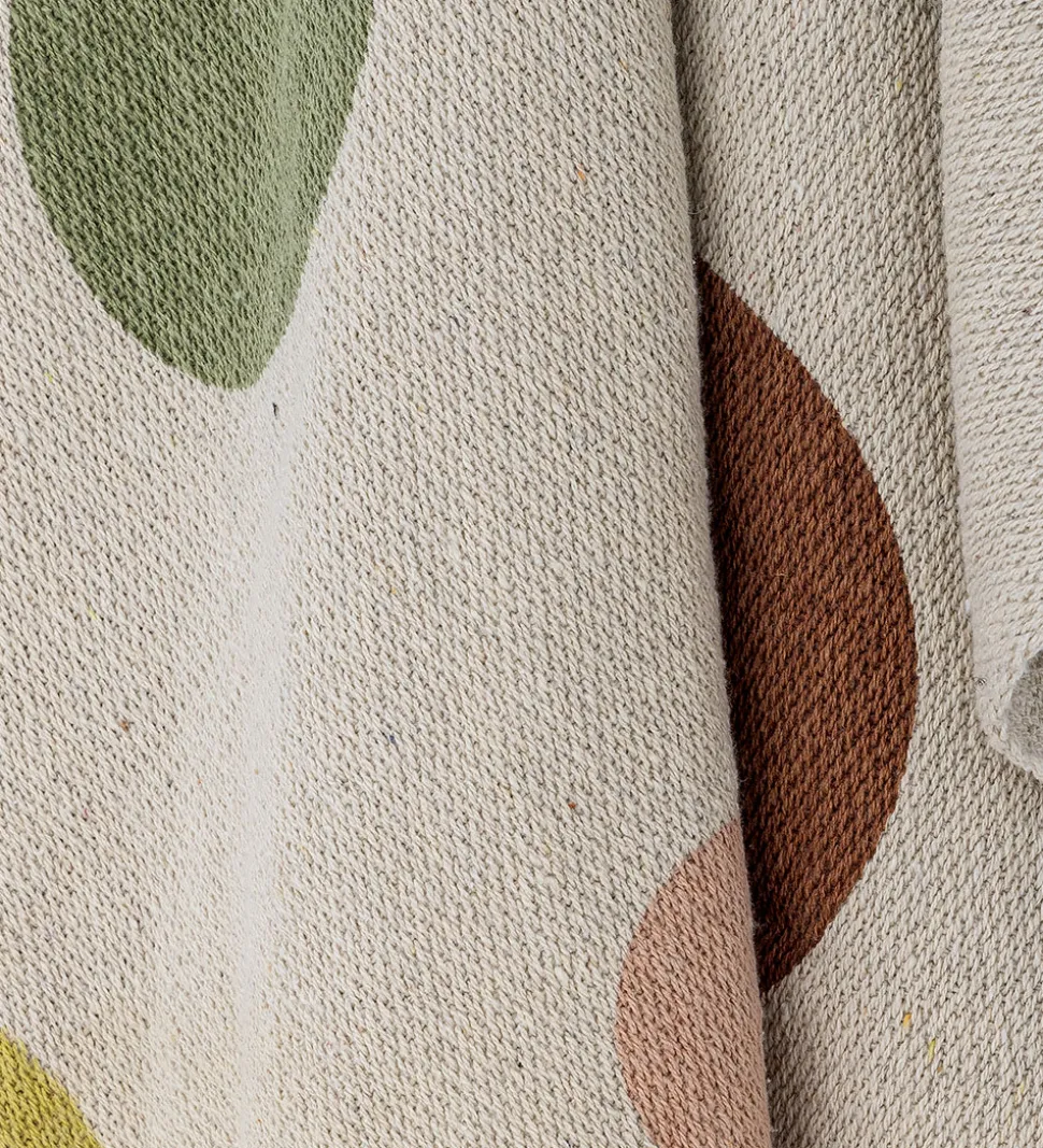 Lækkert Bloomingville tæppe i beige med et print af prikker i forskellige størrelser og farver.