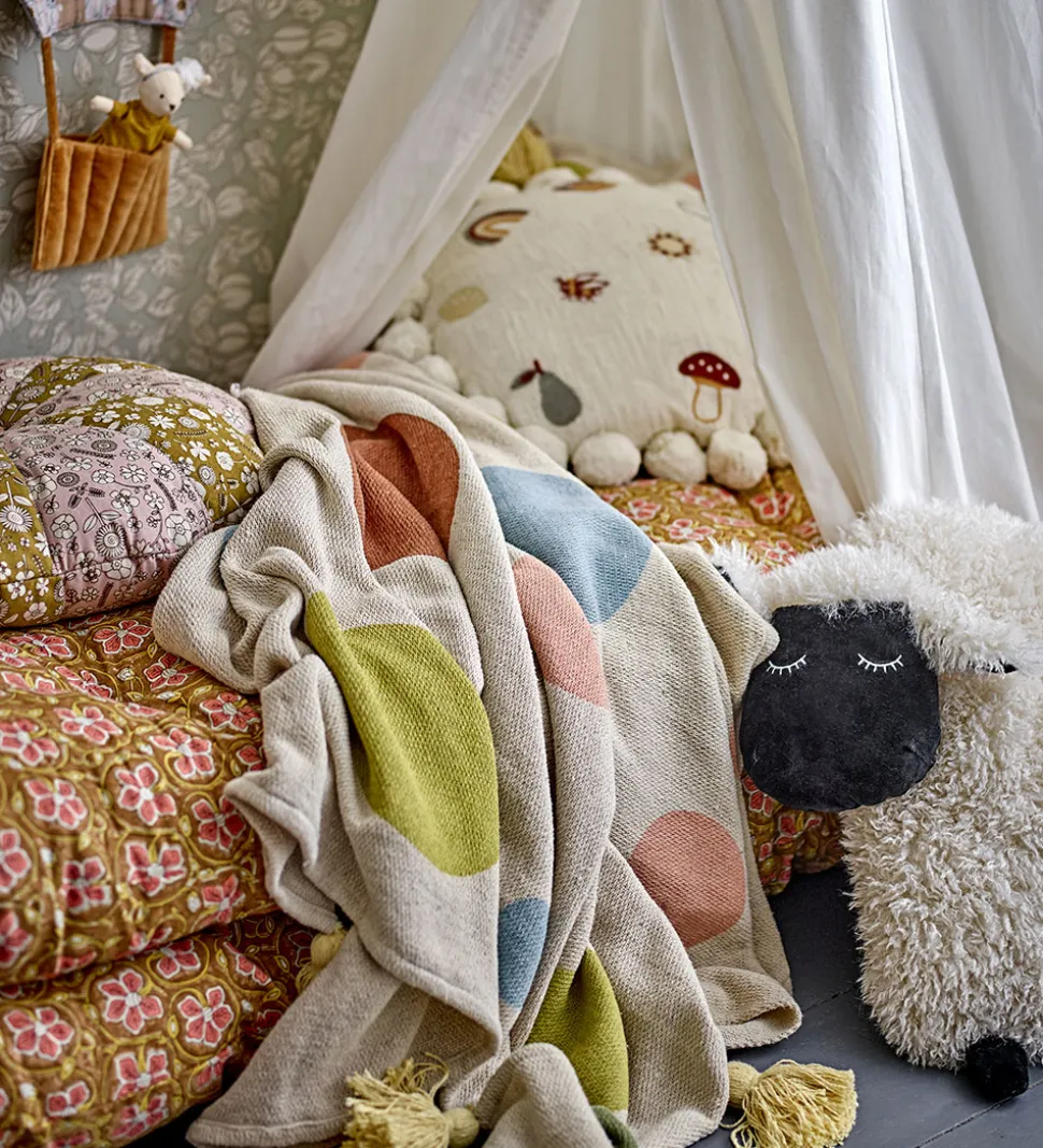 Bloomingville tæppet har, udover et flot print, fine kvaster i hjørnerne hvilket tilføjer et charmerende touch til børneværelset.