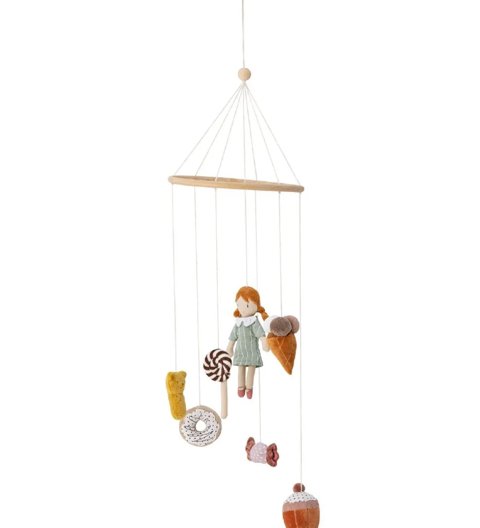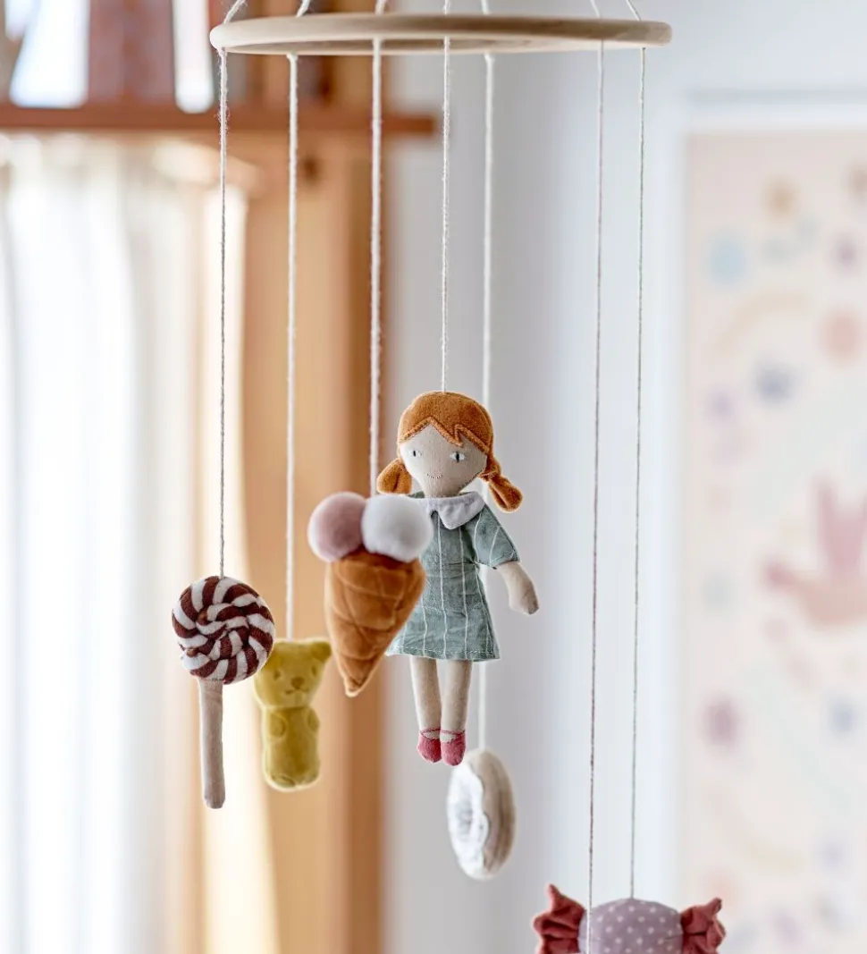 Sød Bloomingville uro med syv forskellige objekter i form af pigen Rosana, en bamse, en donut, en cupcake, en isvaffel, en slikkepind og en karamel.