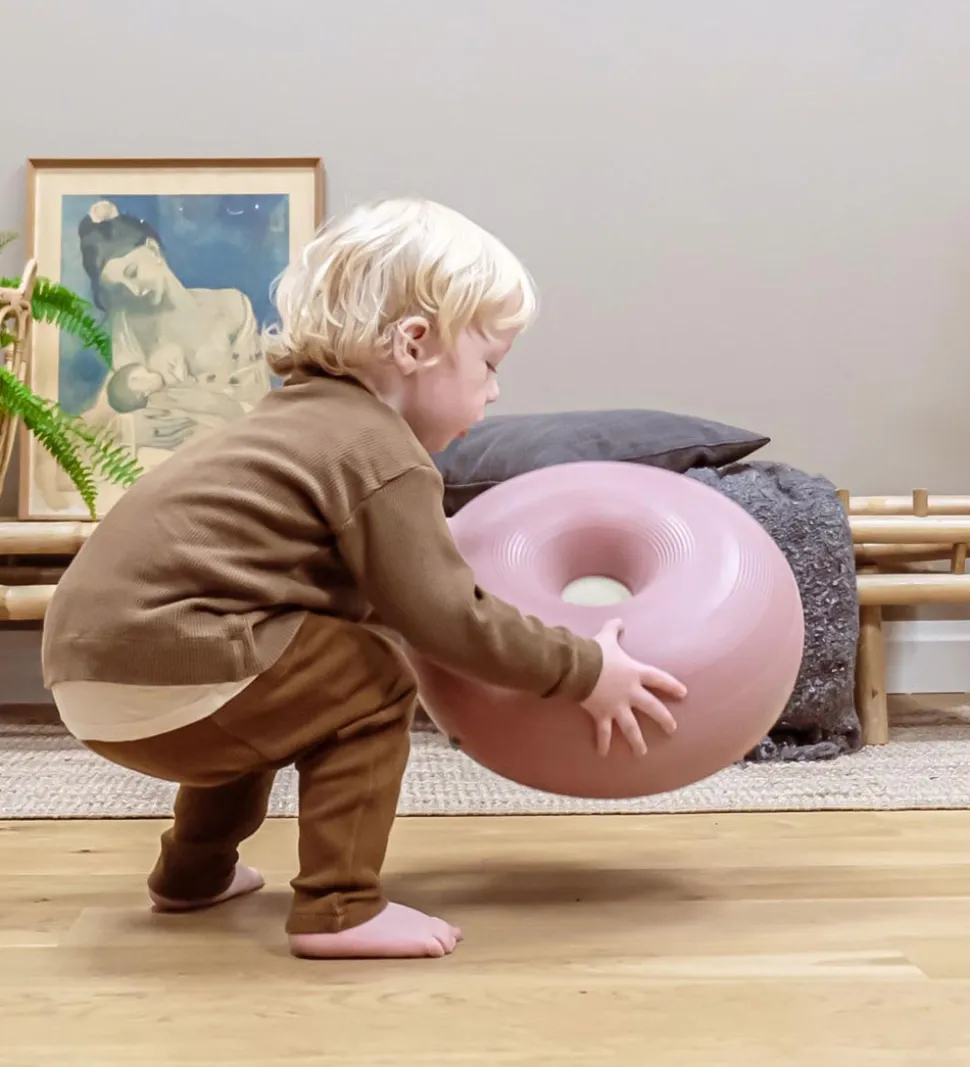 Hvis man trykker donutten ned mod gulvet, opstår der et vacuum, så den sætter sig fast. Så har man en sjov og stabil pude, der fungerer som afsæt til masser af tumleleg. Det er kun fantasien, der sætter grænser.