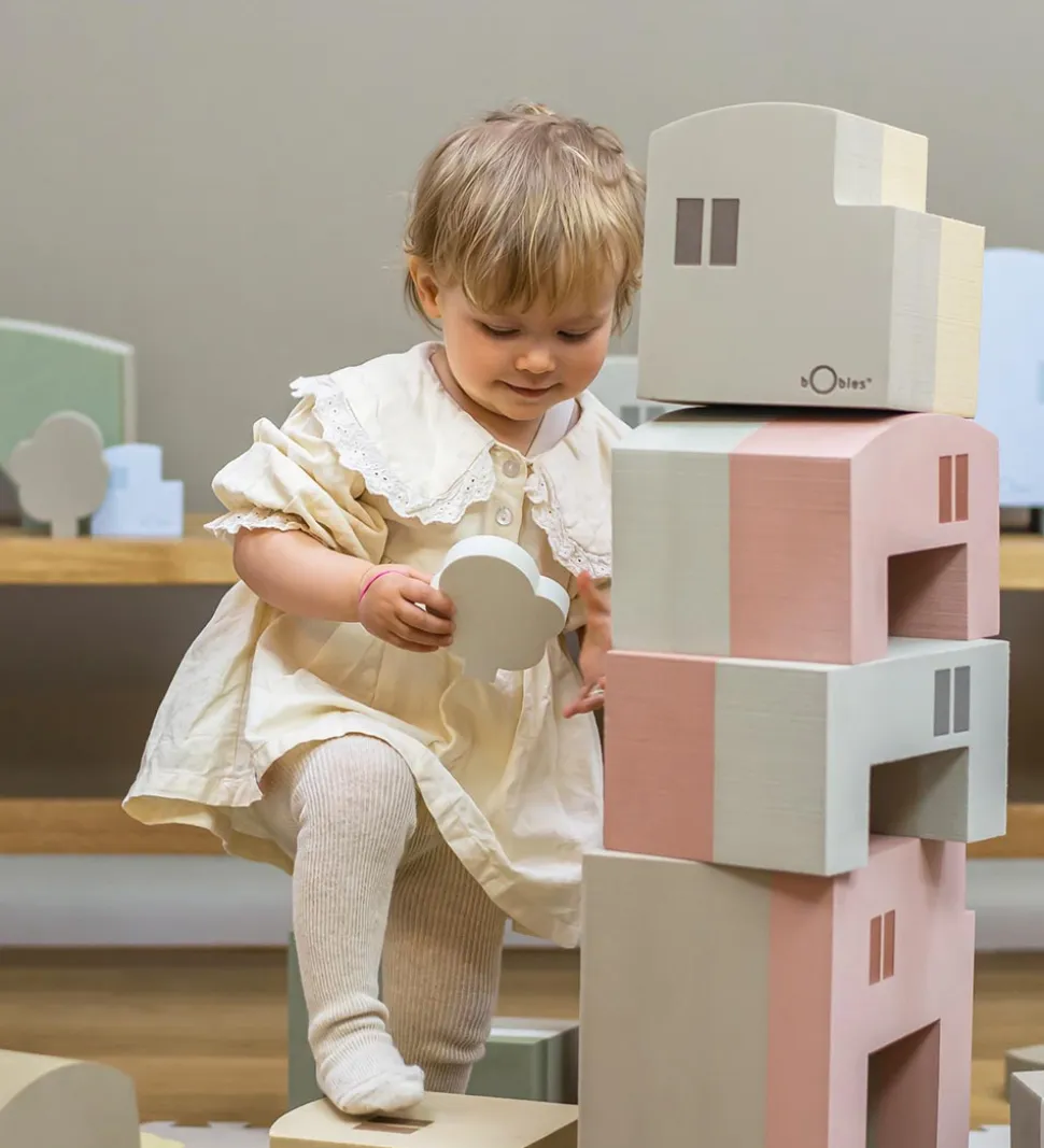 bObles tumlemøblet er dekoreret som et hus, og det er fladt i bunden, og i toppen er det buet. Det kan bruges som en lille skammel, eller som en del i tumlelege eller balancelege, og sammen med de andre figurer i serien kan man bygge sin egen by. Så er der lagt op til at slippe fantasien løs og udfordre motorikken.