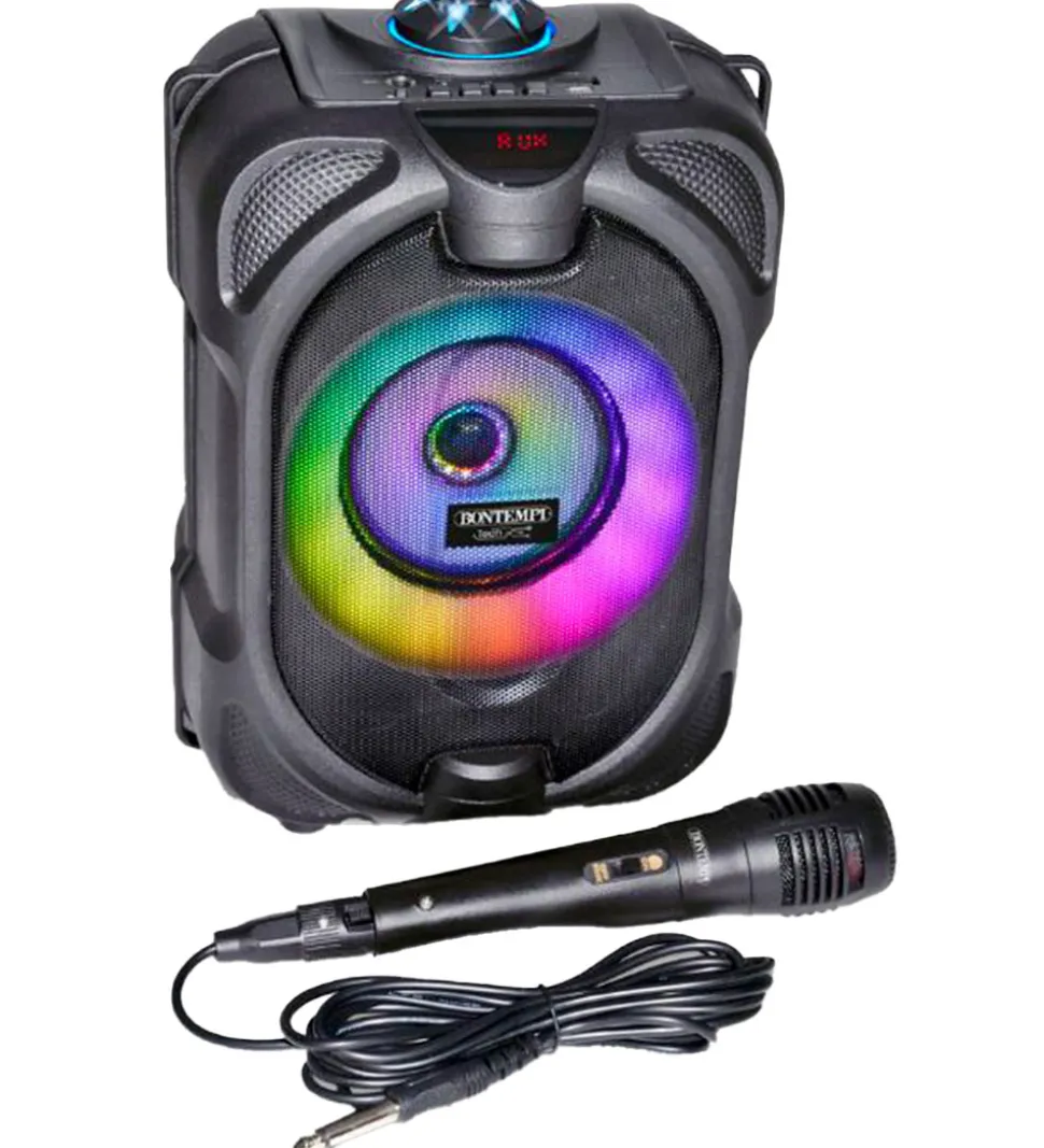 Bontempi højtaleren er trådløs, og den er lille og let, så den er nem at have med på farten. Højtaleren har et genopladeligt litium-batteri, som tilsluttes et usb-stik som medfølger, og den har en kapacitet på 80 W. Der medfølger en mikrofon, så man kan synge med på de sange, den afspiller, og fortil er der lyspaneler, som kan lyse op i alle regnbuens farver. Der er også et betjeningspanel medet praktisk display.