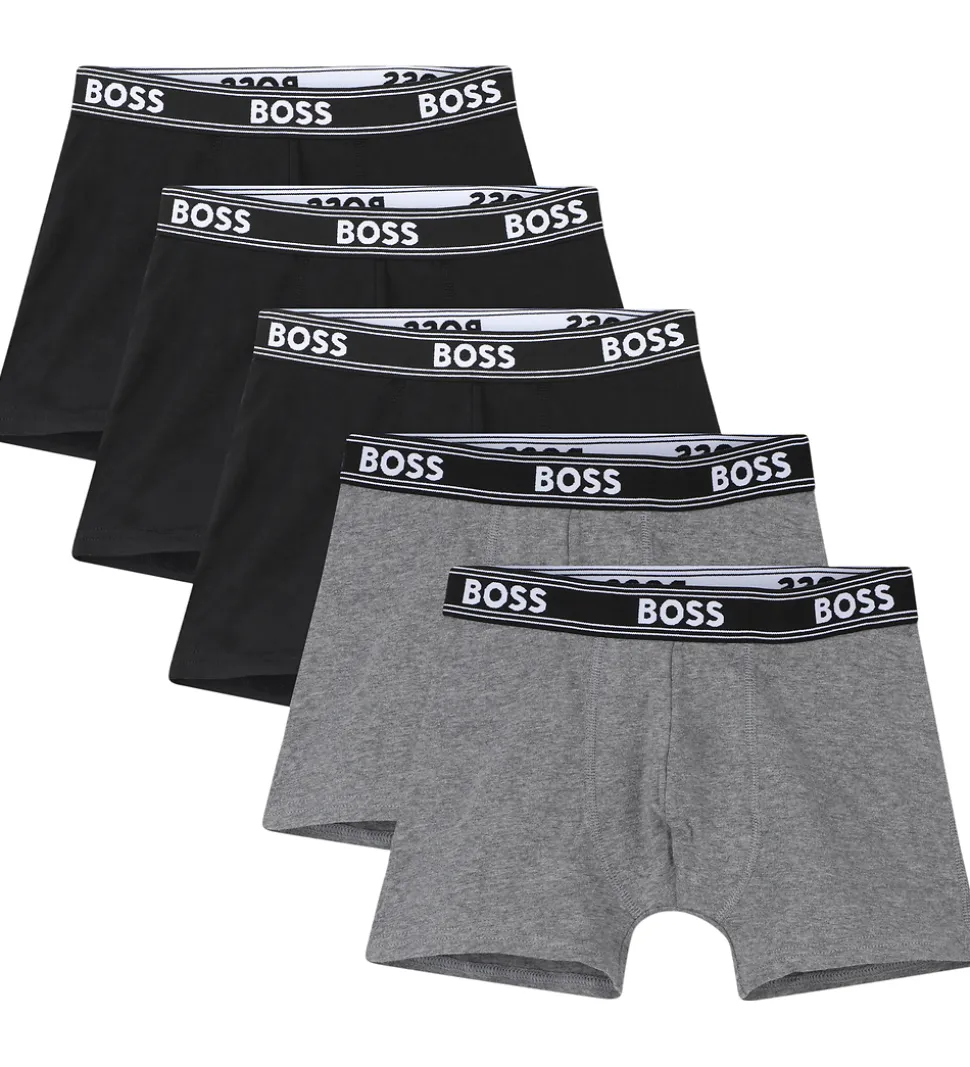 Stilfulde BOSS boxershorts i en pakke med fem par. Disse BOSS boxershorts kommer i farverne sort og gråmeleret. Boxershortsene har en elastikkant i livet med det karakteristiske BOSS logo. Designet sikrer en behagelig og sikker pasform til daglig brug.