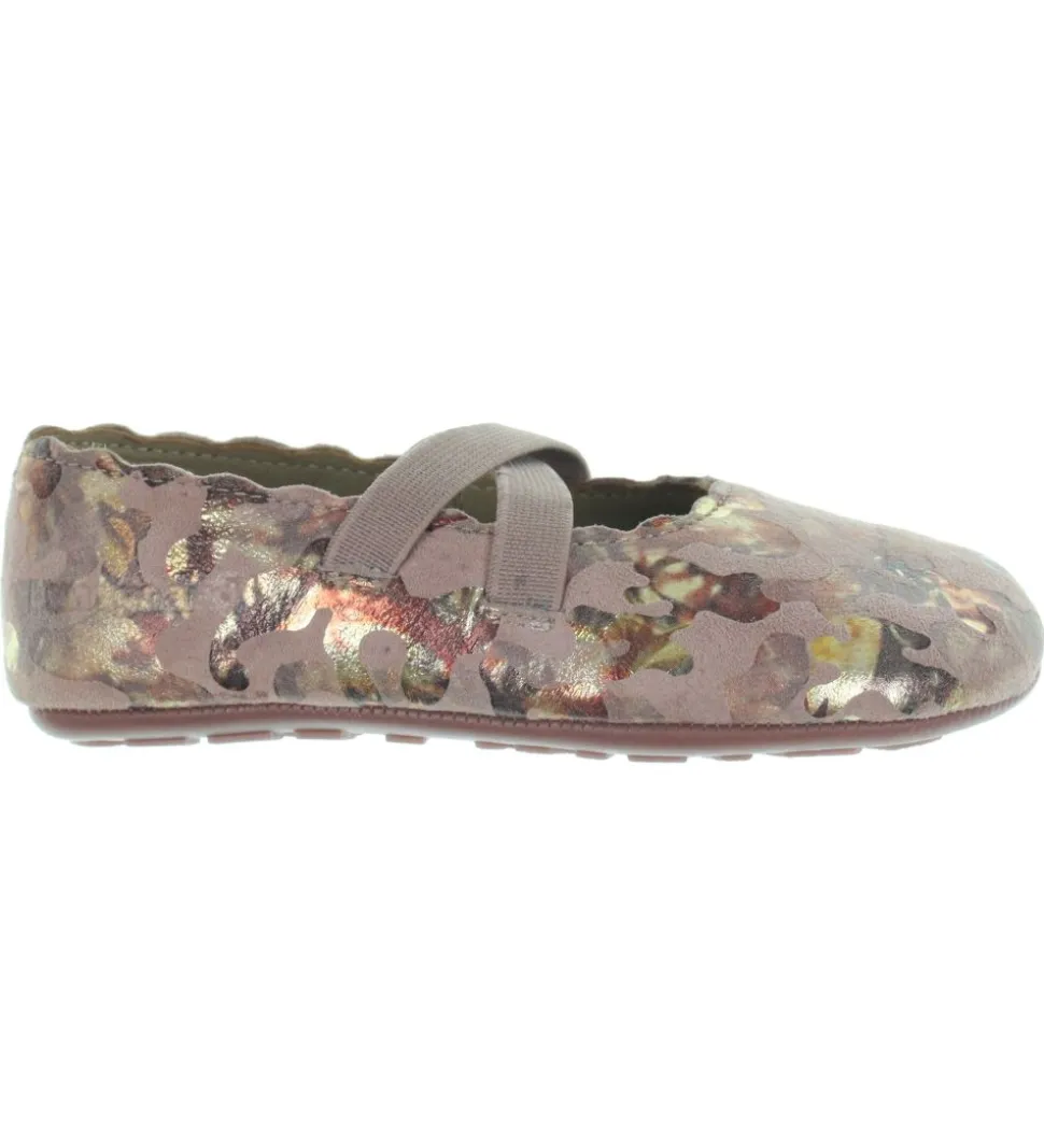 Skønne Bundgaard ballerina hjemmesko i rosa ruskind med et camouflageprint i guld og bronze.