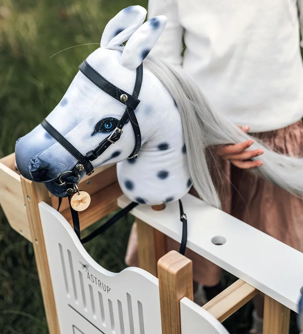 Sjov by ASTRUP hesteboks med plads til fire hæpheste i krydsfiner med en front i hvid med fine detaljer.