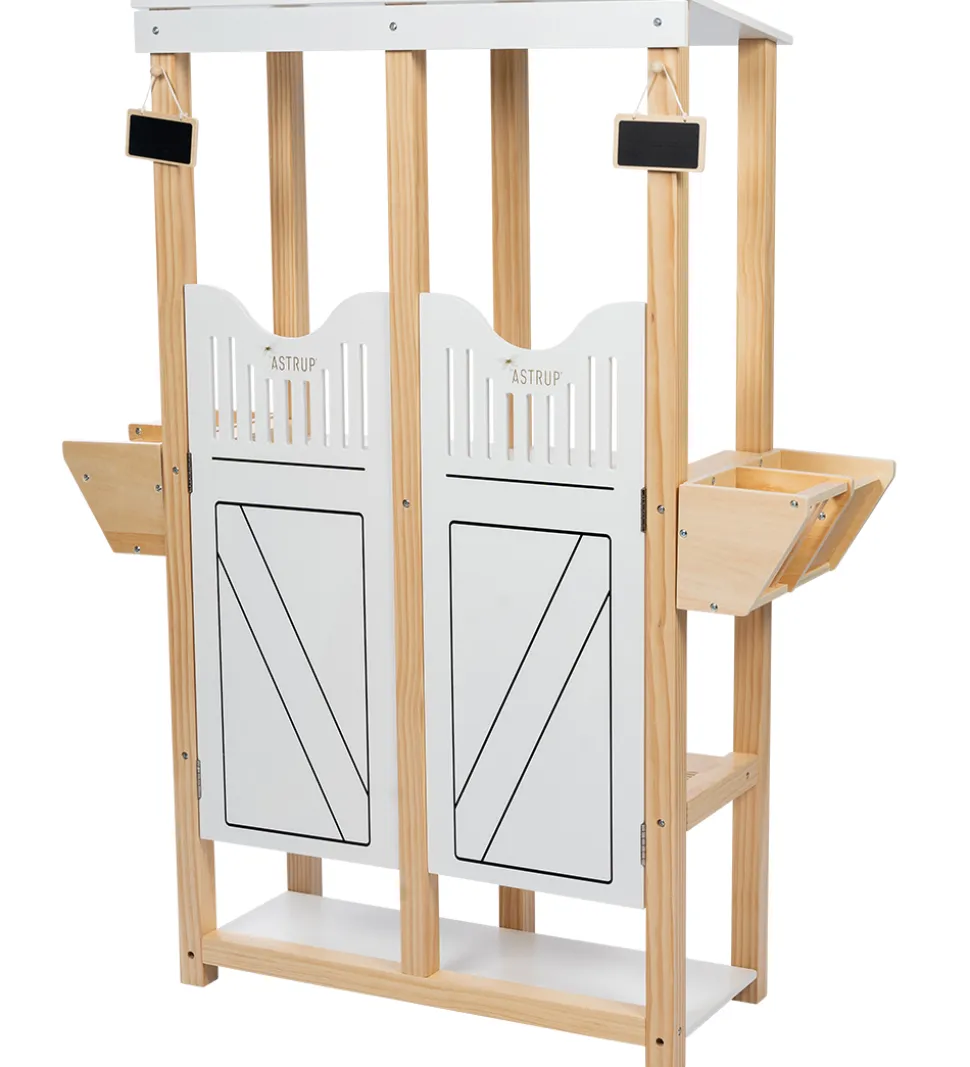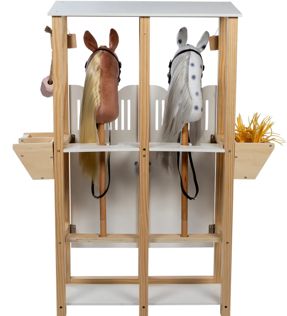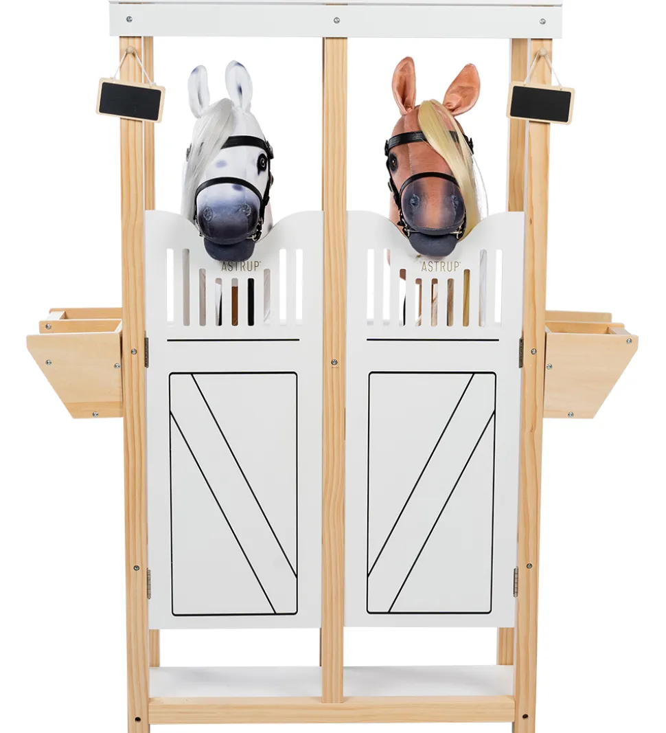 by ASTRUP hestestalden passer til kæpheste med en pind på omkring 40 cm. Fortil er der to låger som kan åbnes, så der er nem adgang til hestene. I siderne er der udhæng med plads til foder til hestene og fortil er der en krog, hvor der hænger en lille tavle, hvor man kan skrive hvem der bor i stalden. Hestestalden kan rumme to kæpheste eller man kan stille et kæphest i den ene side og opbevare tilbehør til hesten i den anden side.
