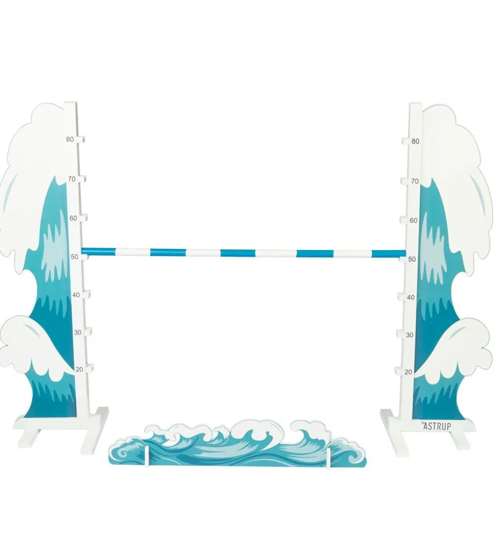Sjovt by ASTRUP spring til kæphest i hvid træ med blå bølger, med en bom i hvid træ med blå striber. Der medfølger en lille bølge, som kan placeres under bommen.