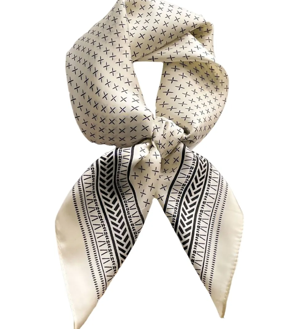 Elegant By Stær tørklæde i hvid med et flot sort geometrisk mønster. By Stær tørklædet er designet med klassiske kryds- og zigzagprint, der tilføjer et stilfuldt touch til enhver garderobe.