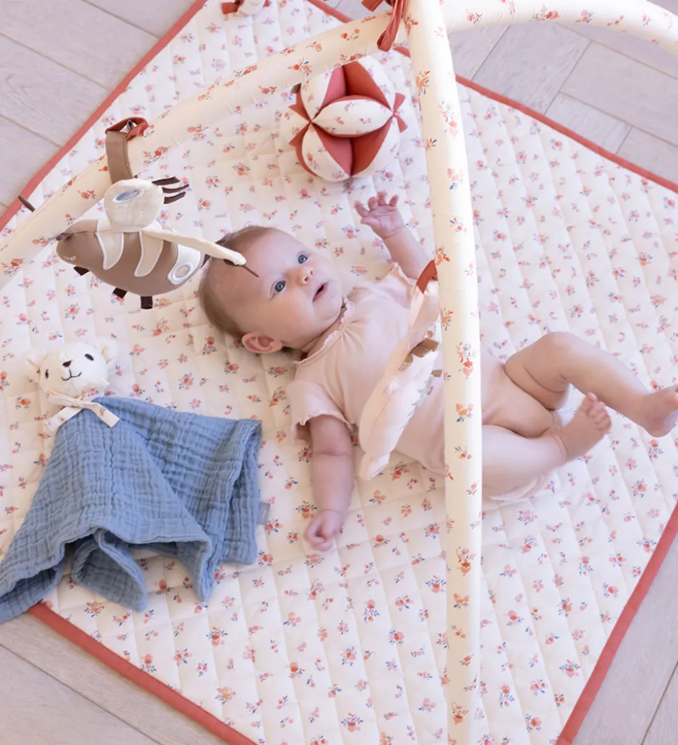 Når barnet kan sætte sig op kan stativet tages af, og tæppet kan bruges som legeunderlag.