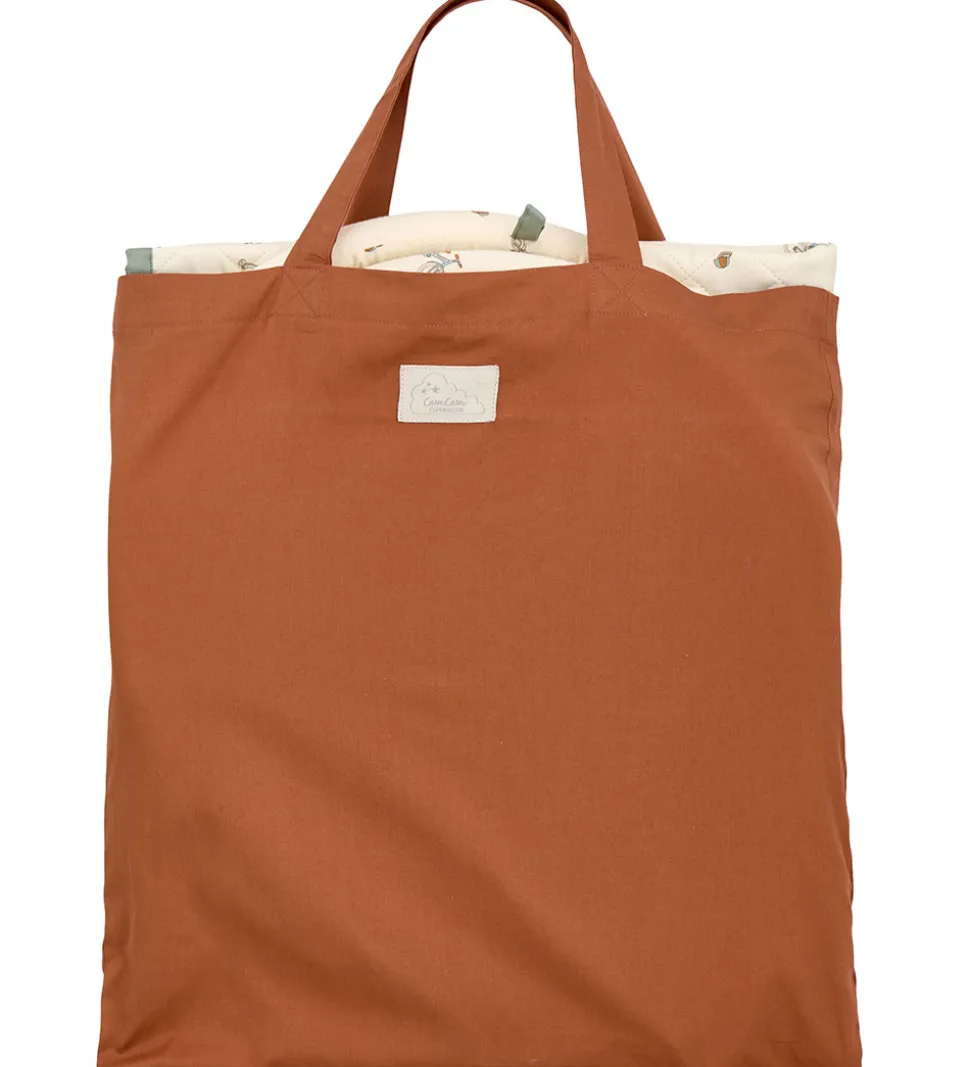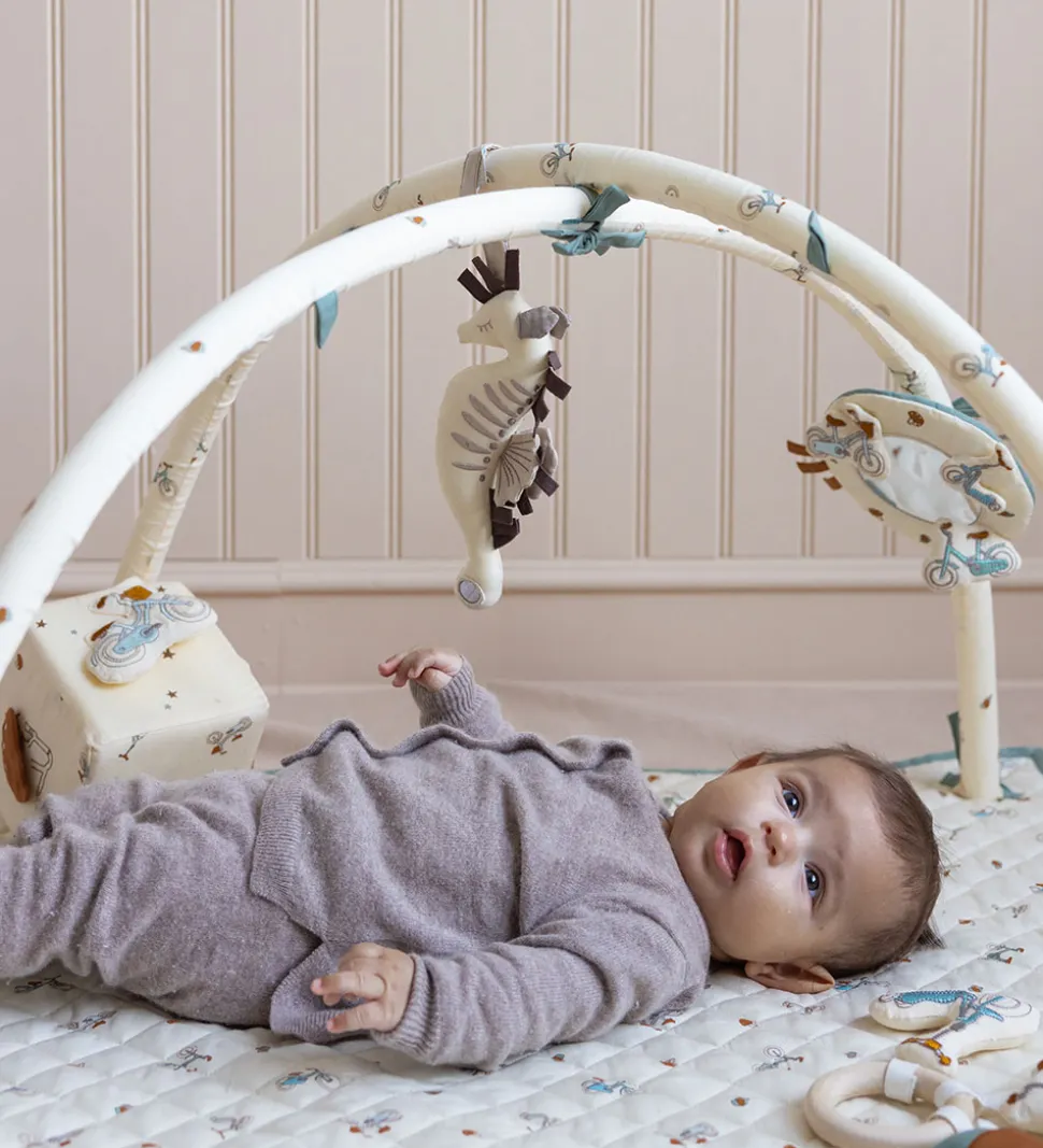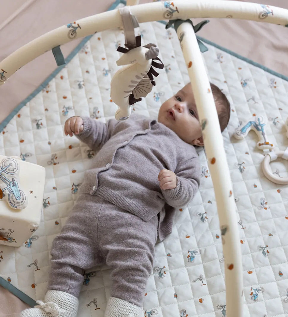Sødt Cam Cam Copenhagen aktivitetsstativ i beige med et alloverprint af fine, små cykler i blå, grønne og brune nuancer.