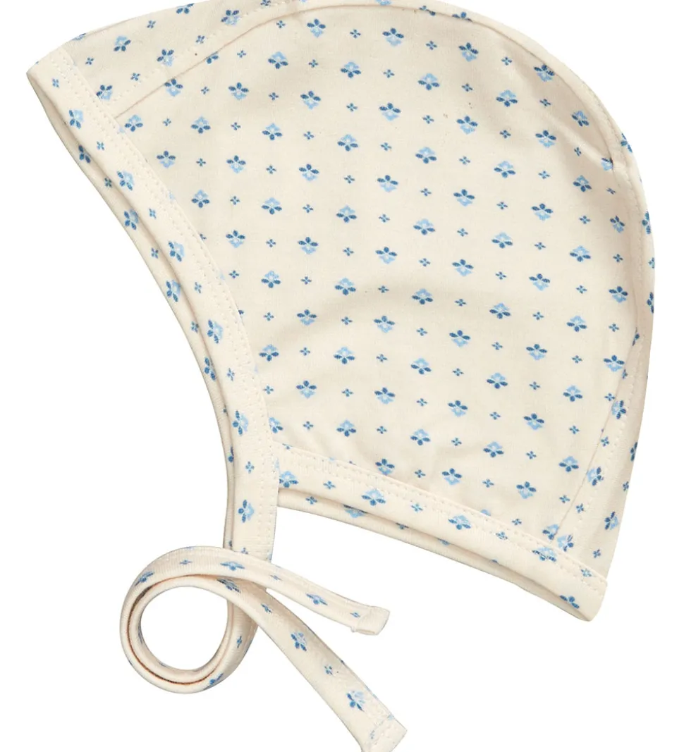 Sød Cam Cam Copenhagen babyhjelm i en cremehvid farve med et alloverprint af fine, små blomster i blå nuancer.