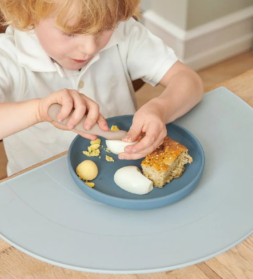 Cam Cam Copenhagen dækkeservietten er i fleksibelt, allergivenligt silikone, som giver en praktisk, skridfast overflade til glas og tallerkner. De smalle forhøjninger fanger krummer og andet mad.